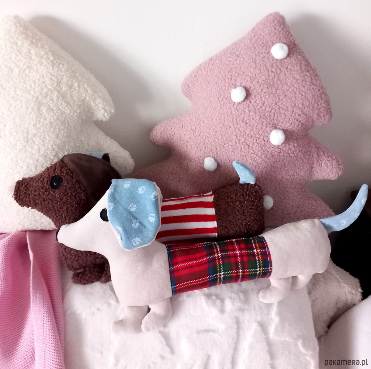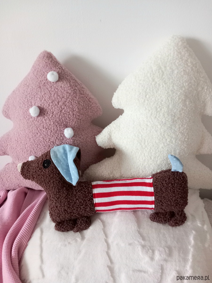 Zabawna a zarazem pocieszna przytulanka jamniczek. Sierść jamniczka została wykonana z niesamowicie miłego w dotyku tkaniny boucle oraz minky.