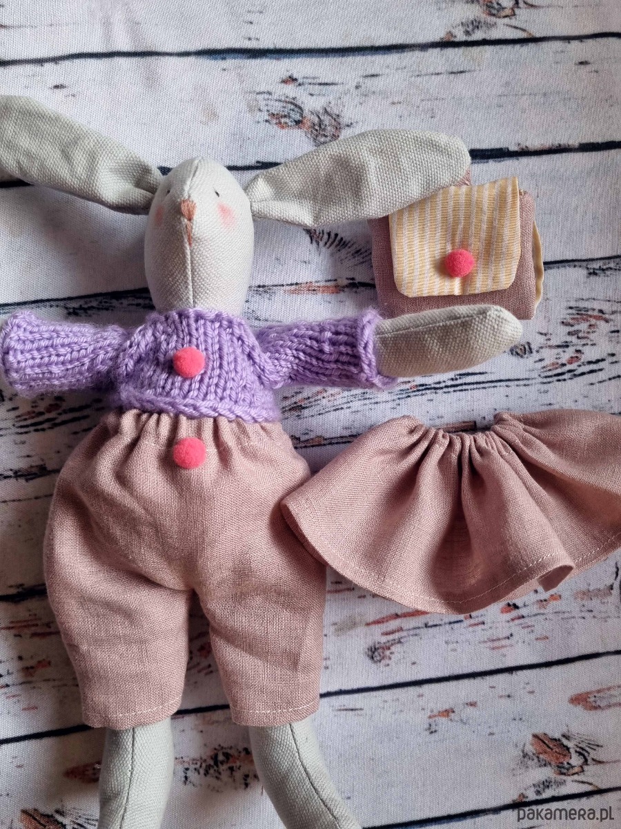 Przytulanka w sweterku z plecakiem i dwoma ubrankami