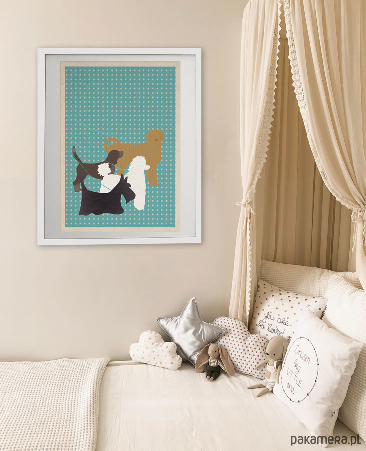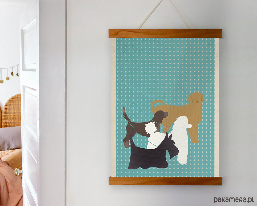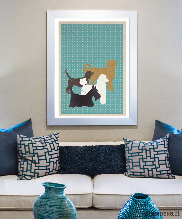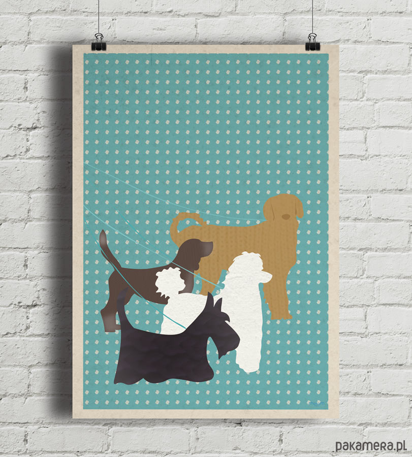Plakat z autorską grafiką przedstawiającą psy (terier szkocki, pudel, beagle, labrador) na spacerze.