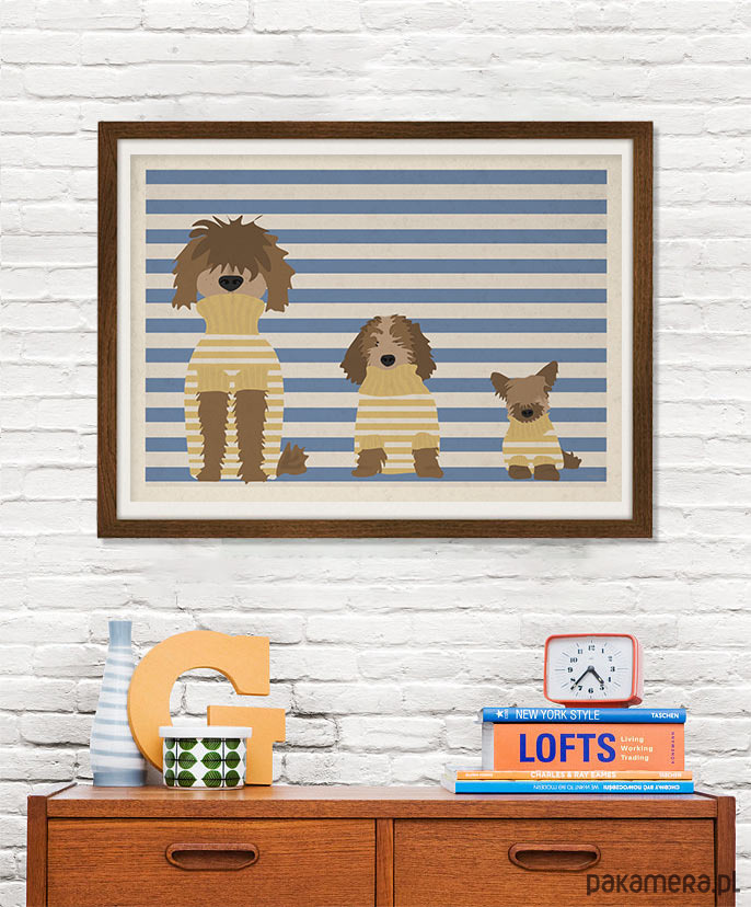 Plakat z autorską grafiką przedstawiającą psy w swetrach. Grafika zaprojektowana przez pracownię Mayam posters.