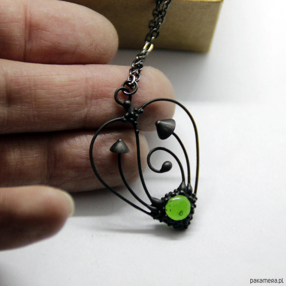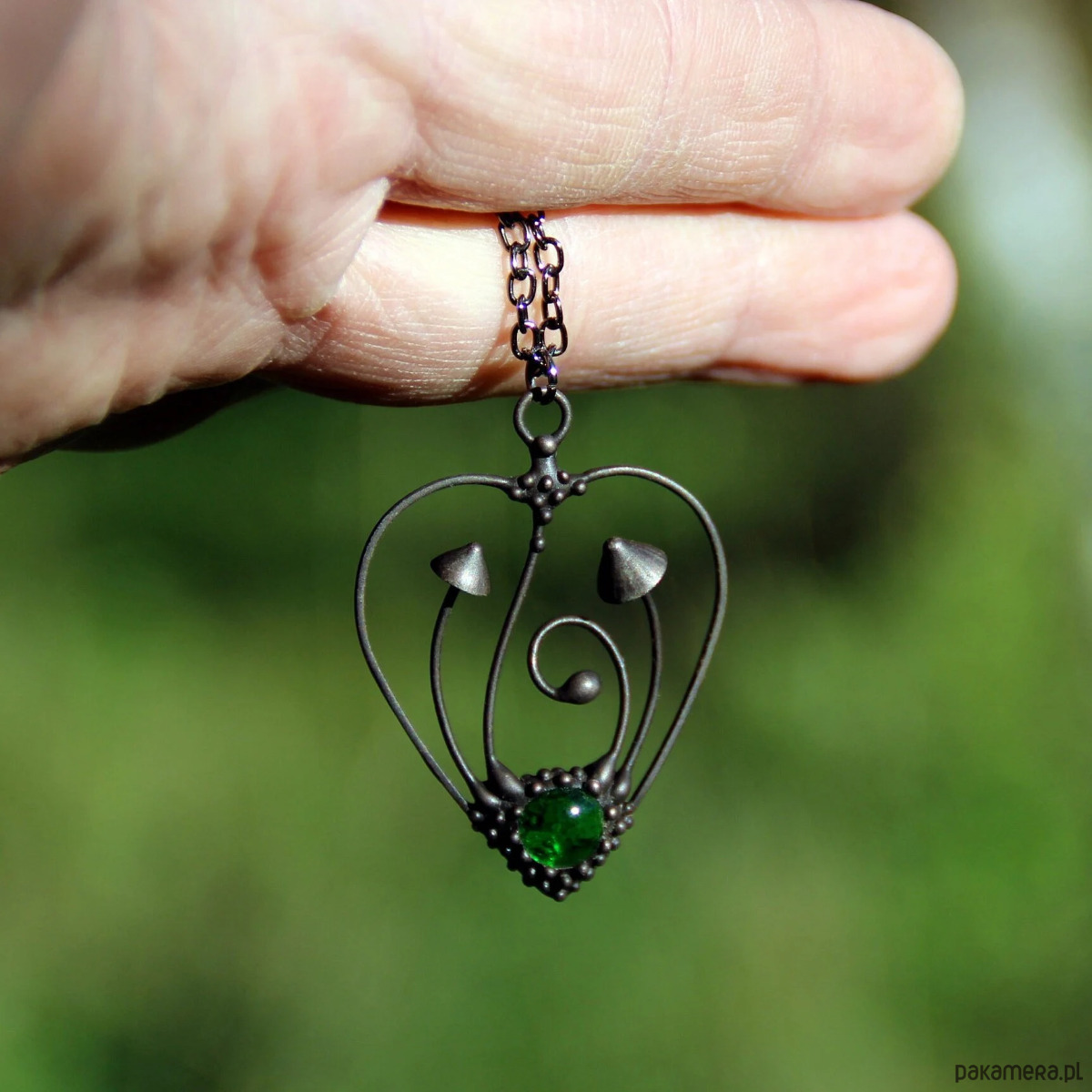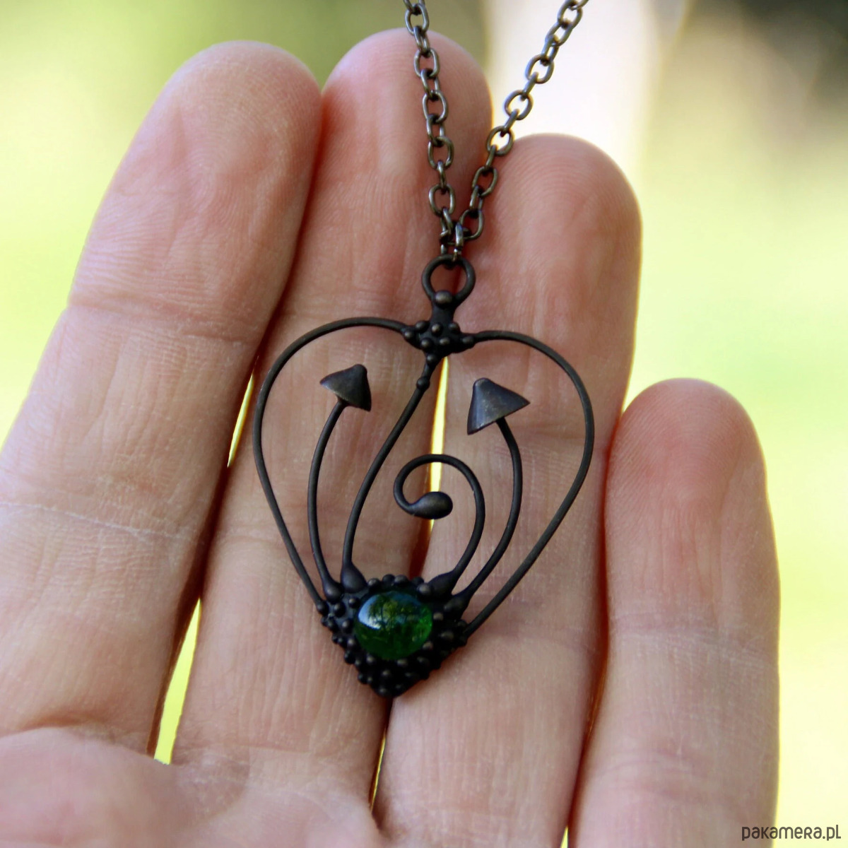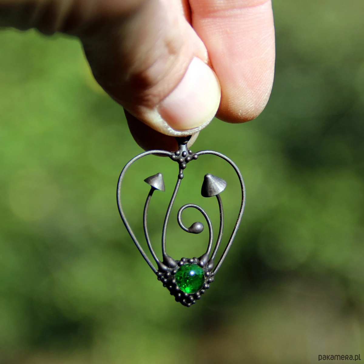 Psychodeliczny wisiorek z grzybem w kształcie serca z zielionym szkłem