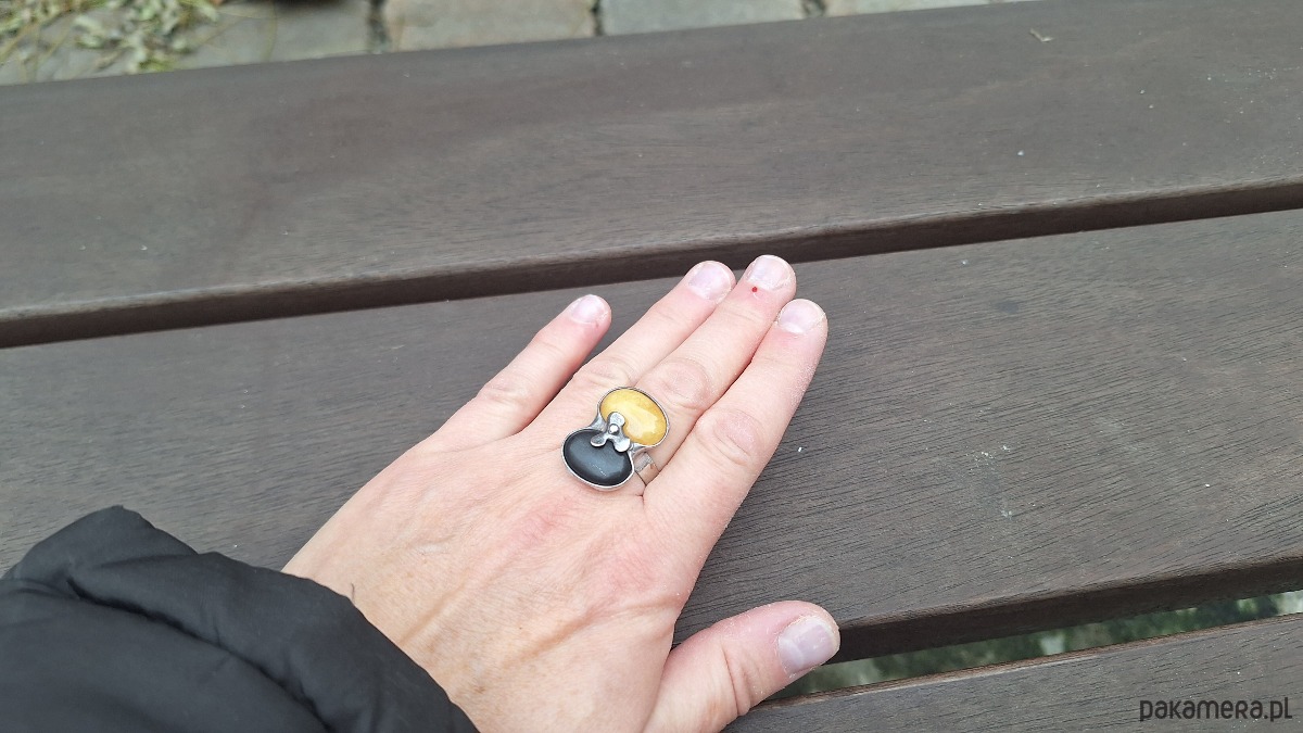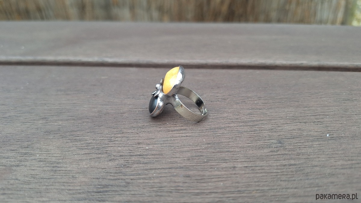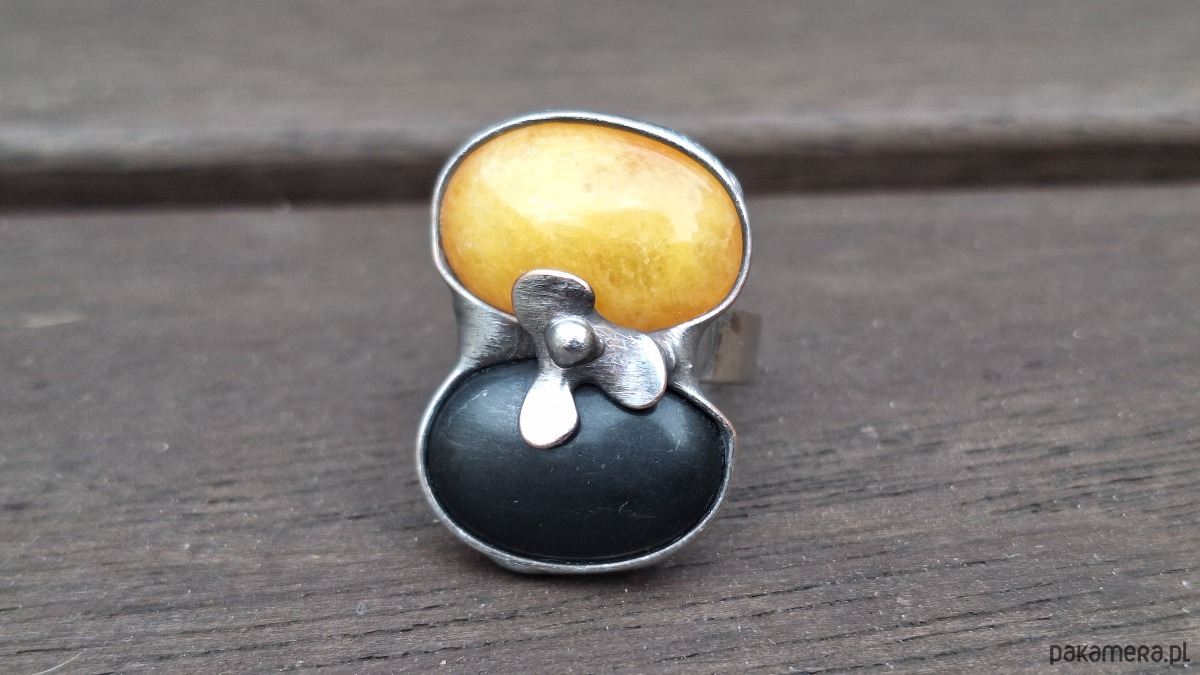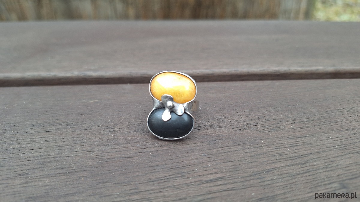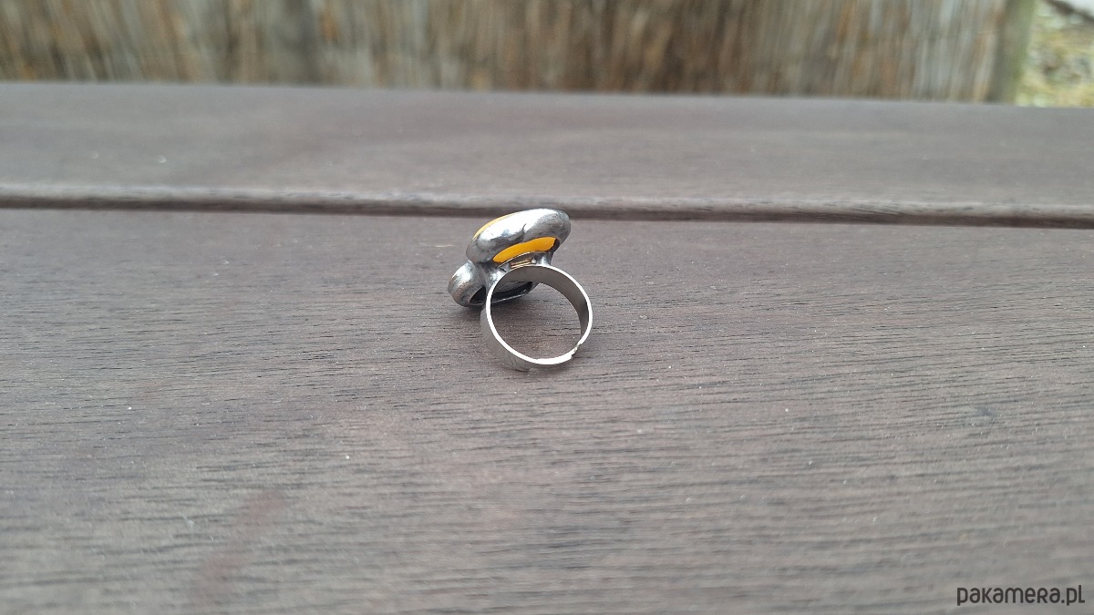 Pierścionek wykonany z miedzi, cyny, jadeitu i onyksu. Wymiary ok. 2.4 na 1.7 cm. Regulowany. Nie jest ciężki.