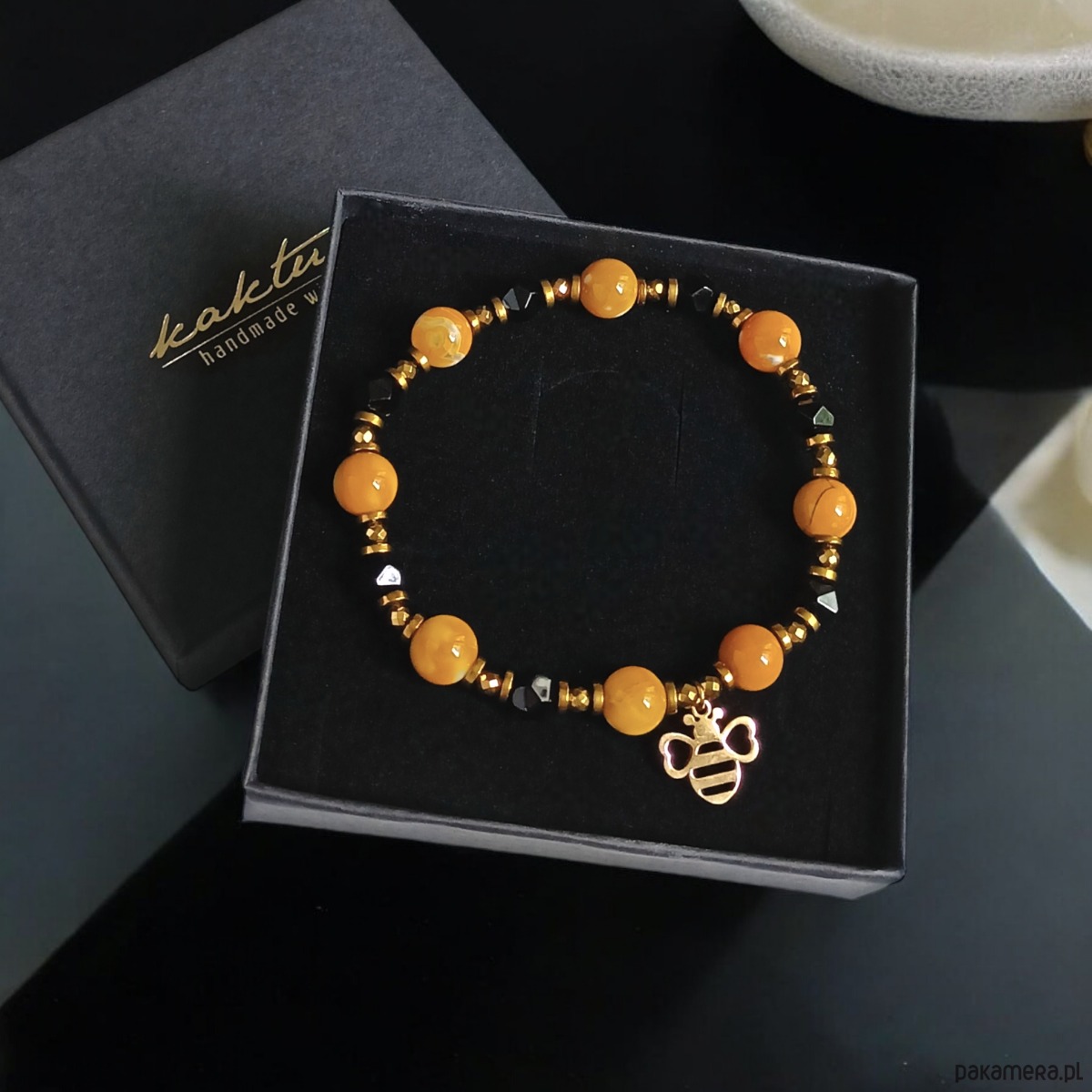 śliczna bransoletka na solidnej lince elastycznej, wykonana z miodowego agatu 8mm (barwa niejednolita), onyksu 6mm (szlif gwiazdkowy), licznych przekładek ze złotego hematytu, pszczółki ze stali szlachetnej pozłacanej (nie uczula).