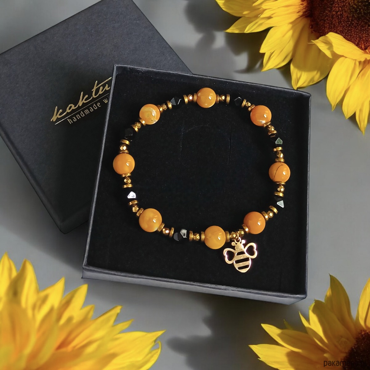 śliczna bransoletka na solidnej lince elastycznej, wykonana z miodowego agatu 8mm (barwa niejednolita), onyksu 6mm (szlif gwiazdkowy), licznych przekładek ze złotego hematytu, pszczółki ze stali szlachetnej pozłacanej (nie uczula).