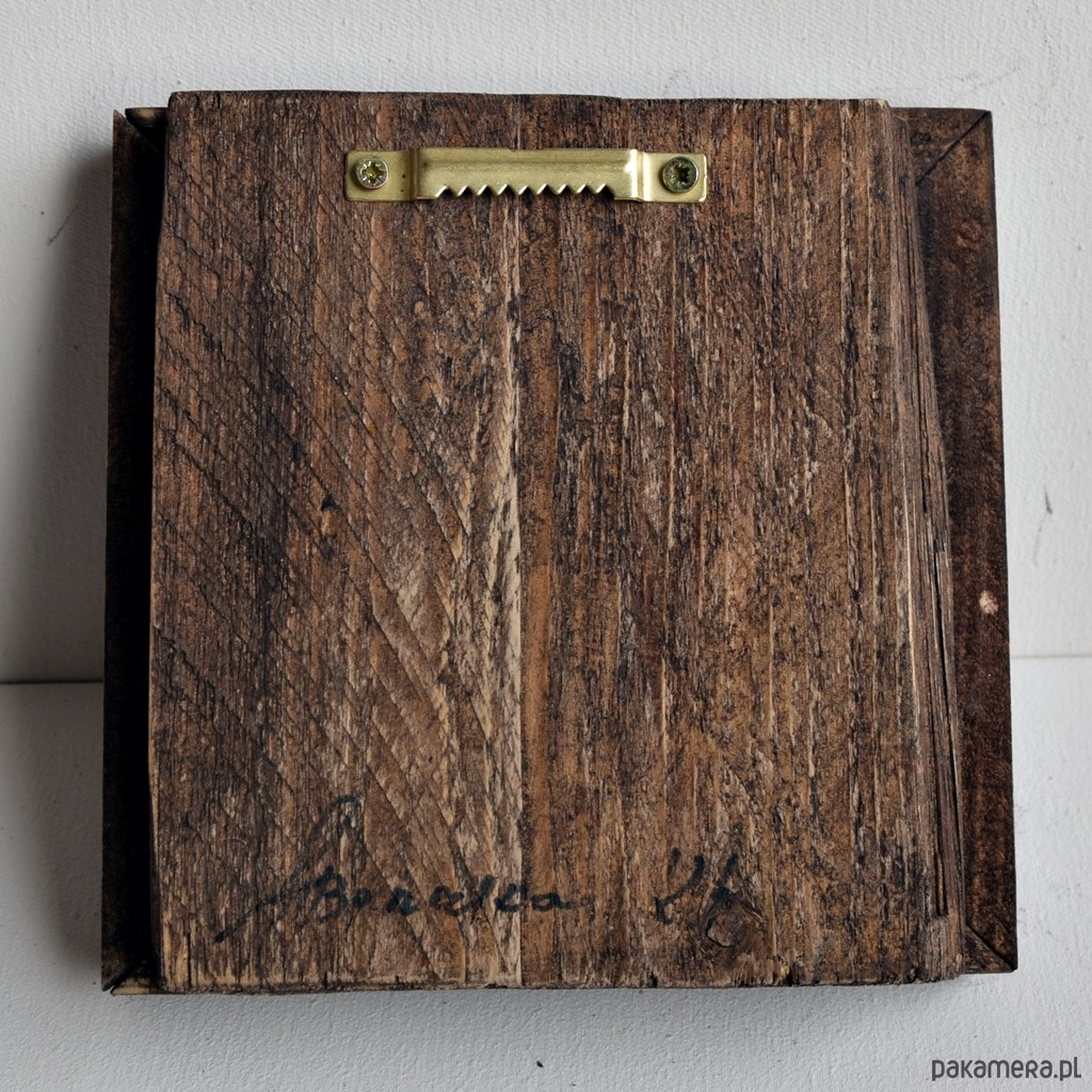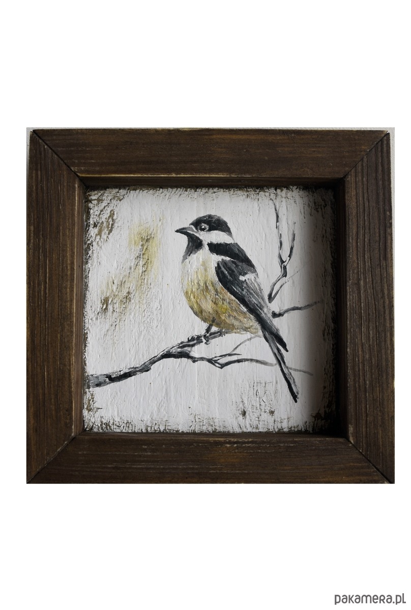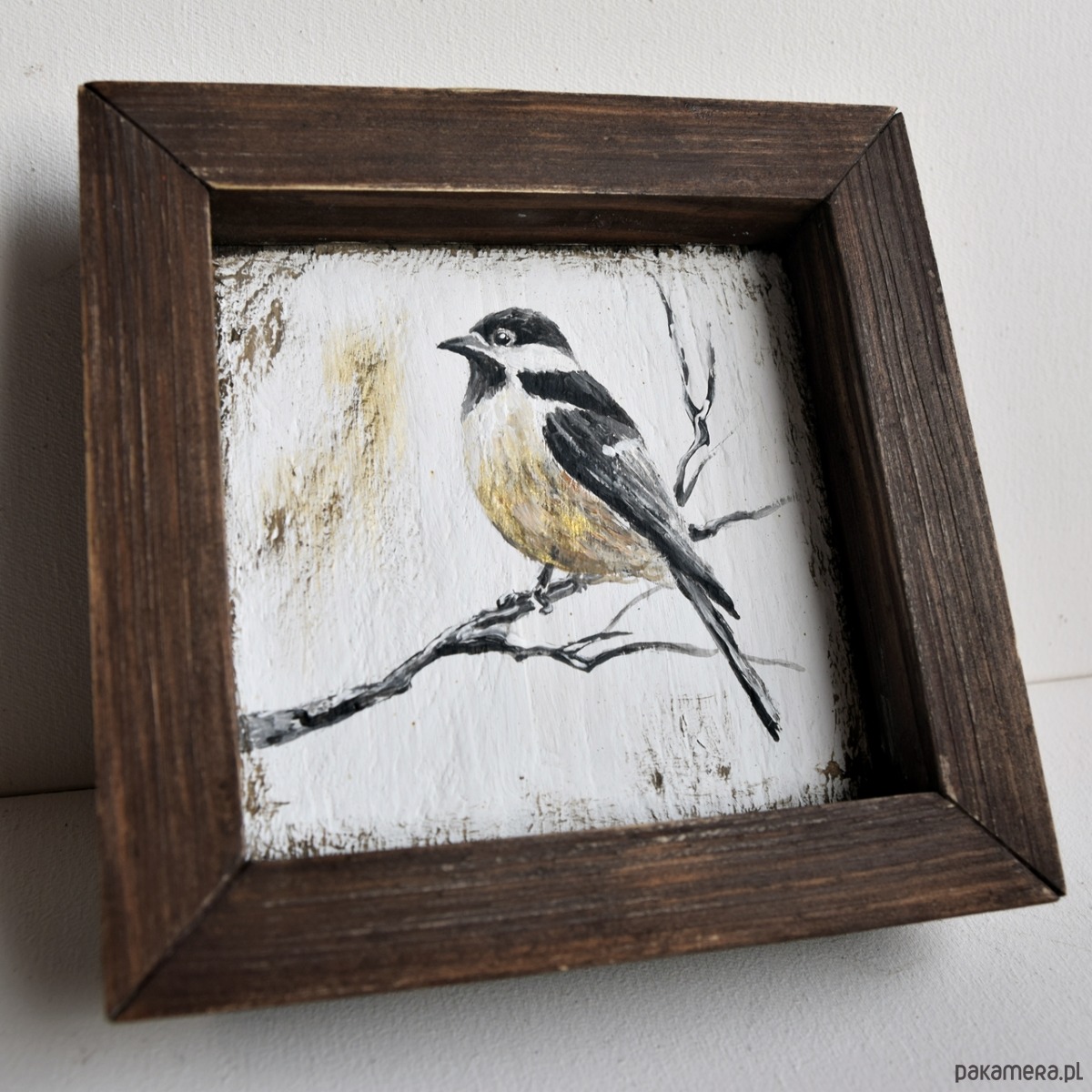 Obraz-miniatura malowany farbami akrylowymi na kawałku starej deski, z ręcznie malowaną ramką z listewek sosnowych (tył deski i ramka- bejcowane). W desce celowo zostawiłam niedoskonałości w postaci nierówności i otworów po gwoździach by zachować jej historię.