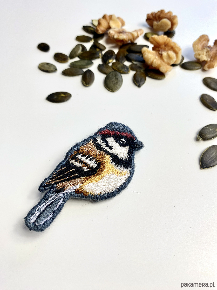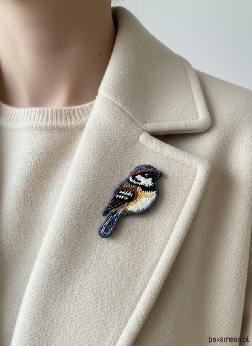 Haftowałam go ręcznie, powoli, skupiając się na kolorach i nastroju. Jest w nim coś znajomego i ciepłego, bez przesady i bez dekoracyjności na siłę. To broszka, która nie konkuruje z resztą stylizacji — raczej ją uzupełnia.