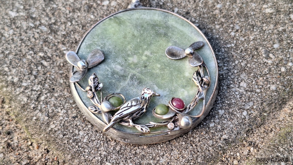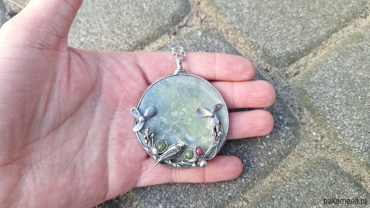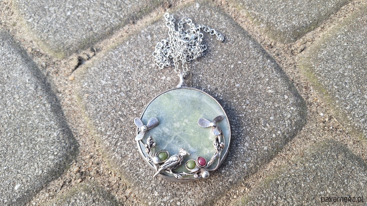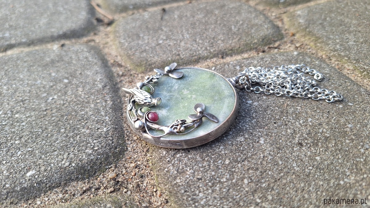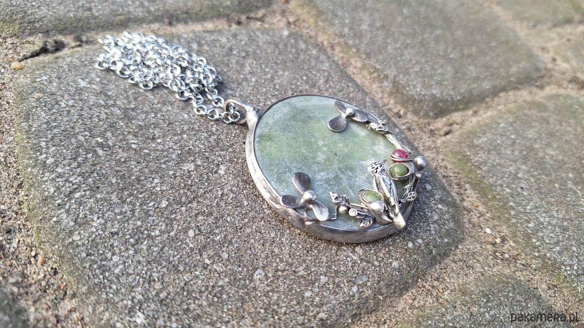 Wisiorek wykonany z miedzi, cyny, jadeitu i turmalinów. Wymiary ok. 5 na 5 cm. Zawieszony na łańcuszku o długości ok. 50 cm.