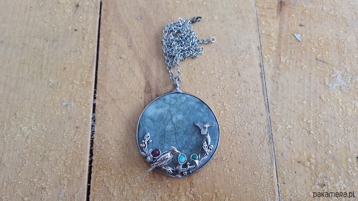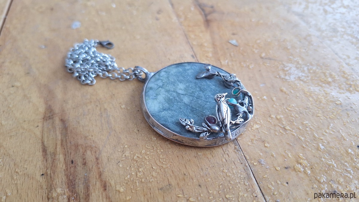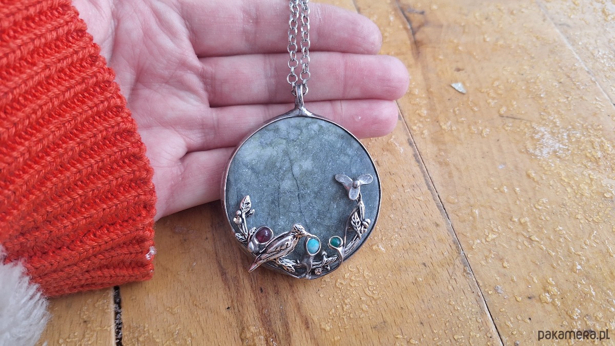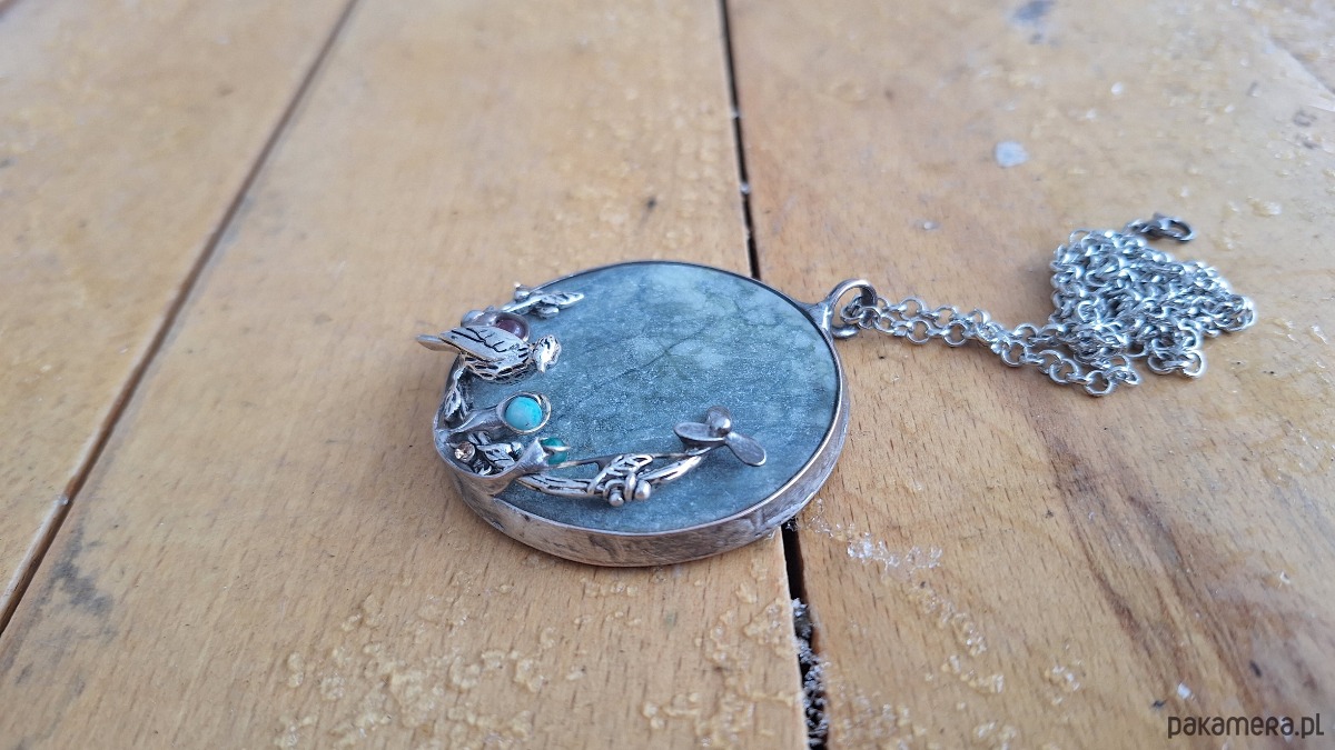Wisiorek wykonany z miedzi, cyny, jadeitu, turmalinu i amazonitu. Wymiary ok. 5 na 5 cm. Zawieszony na łańcuszku o długości ok. 50 cm.