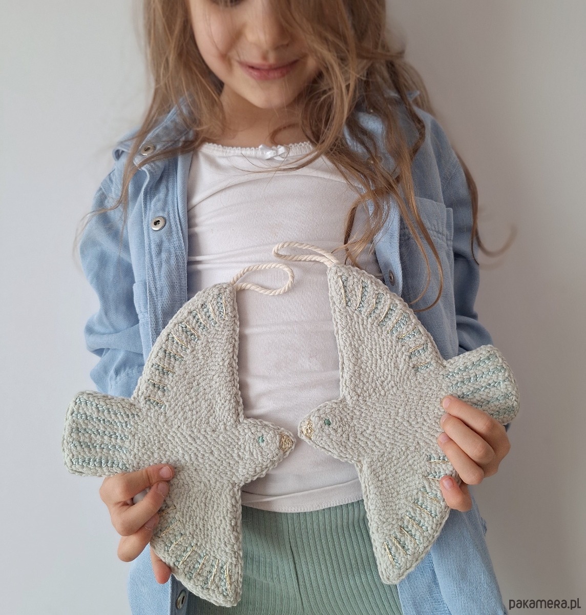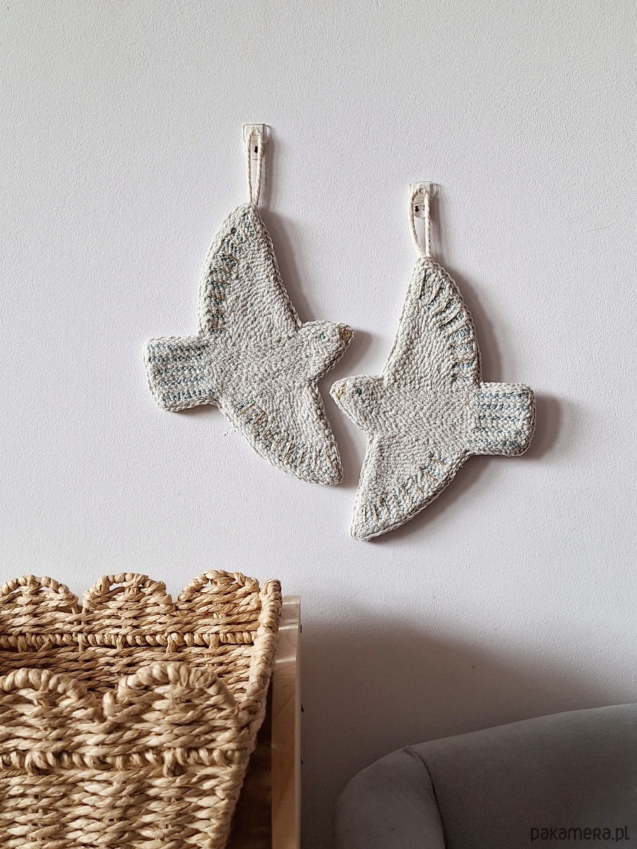 Ten zestaw składa się z dwóch jasnoszarych zawieszek w kształcie ptaszków. To delikatna dekoracja ścienna stworzona z myślą o pokoju dziecka, ale pasuje również do innych wnętrz. Ręcznie haftowane ptaszki idealnie wpisują się w estetykę stylu skandynawskiego, japandi, boho czy minimalistycznego.