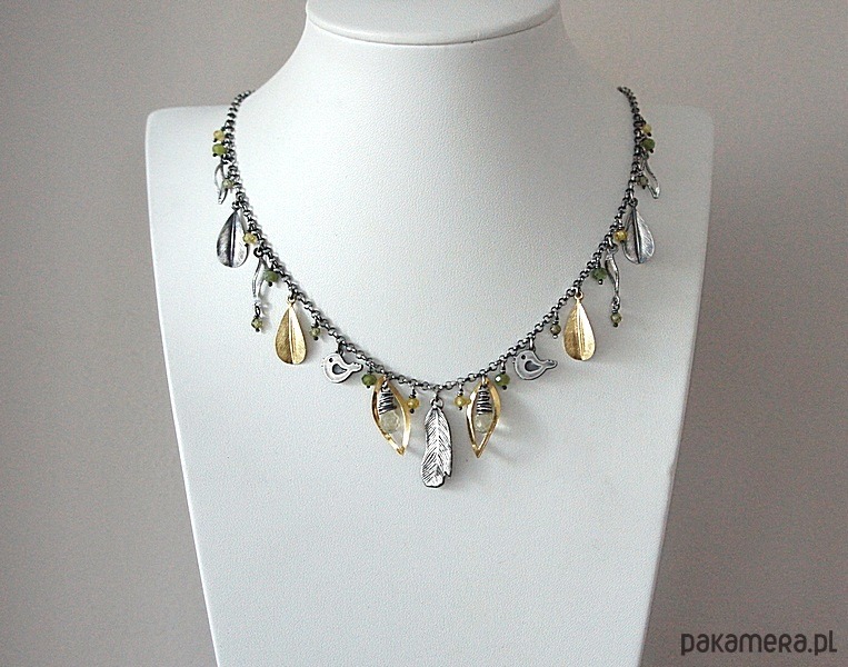Krótki naszyjnik wykonany ze srebra i srebra pokrytego 24k złotem [pr. 925] w połączeniu z fasetowanymi kropelkami kwarców lemon [10mm], kuleczkami nefrytów [4mm], cyrkoniami [ 3mm] oraz srebrnymi piórkami i blaszkami. Srebro częściowo oksydowane i przetarte. Całkowita długość naszyjnika około 47,7 cm. Biżuteria ozdobnie zapakowana.