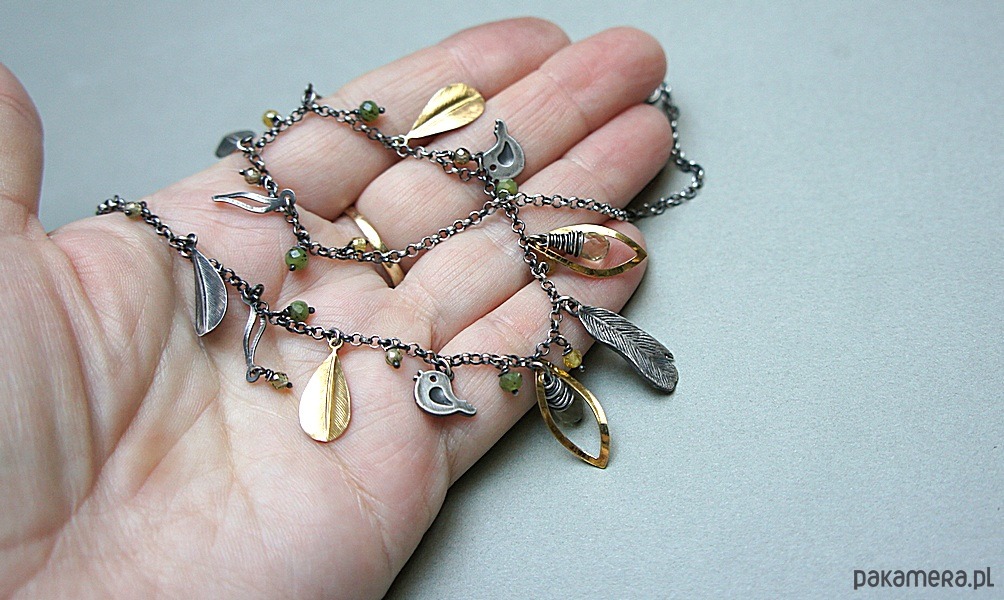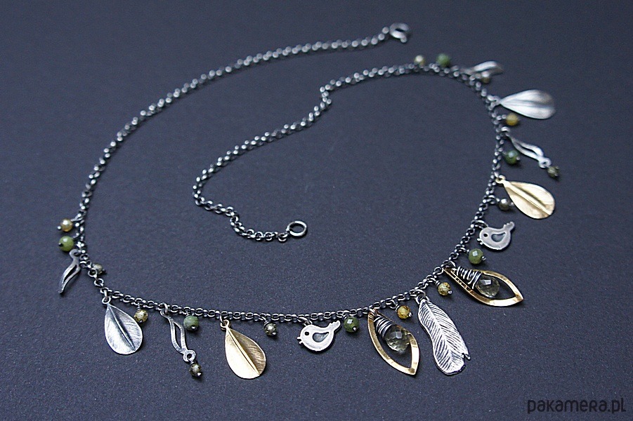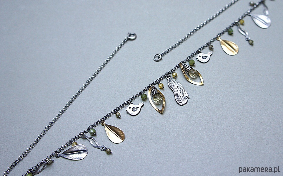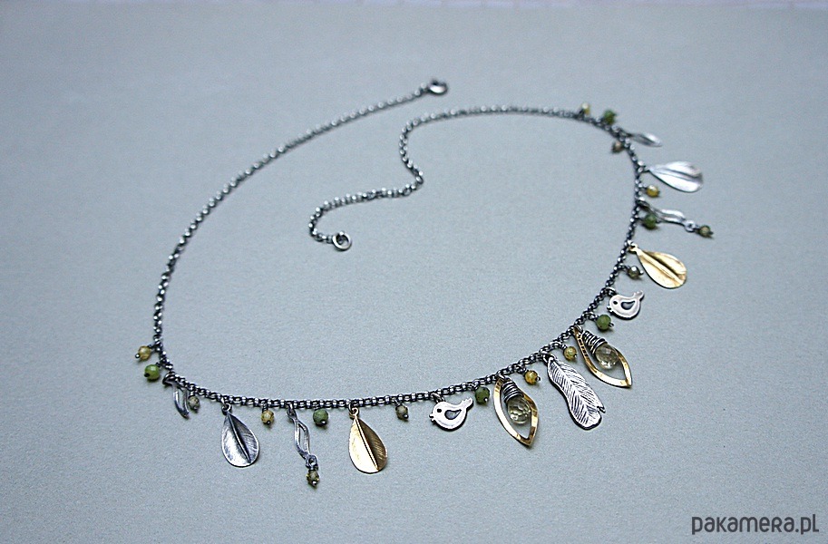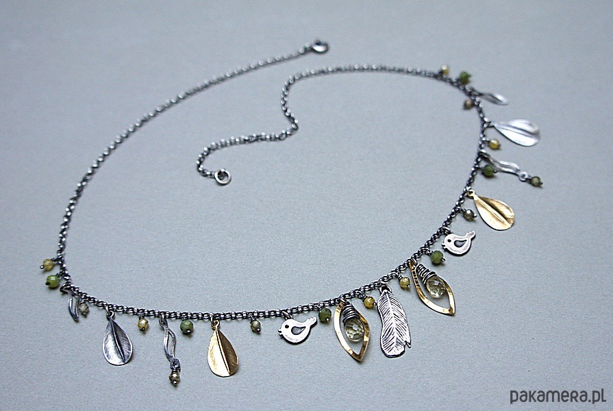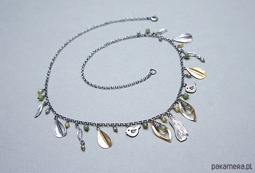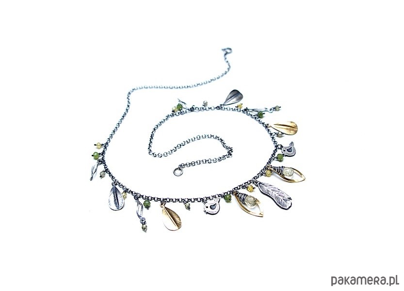 Krótki naszyjnik wykonany ze srebra i srebra pokrytego 24k złotem [pr. 925] w połączeniu z fasetowanymi kropelkami kwarców lemon [10mm], kuleczkami nefrytów [4mm], cyrkoniami [ 3mm] oraz srebrnymi piórkami i blaszkami. Srebro częściowo oksydowane i przetarte. Całkowita długość naszyjnika około 47,7 cm. Biżuteria ozdobnie zapakowana.