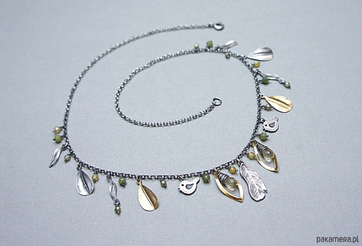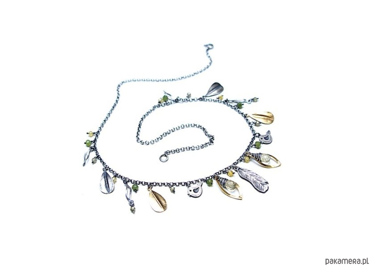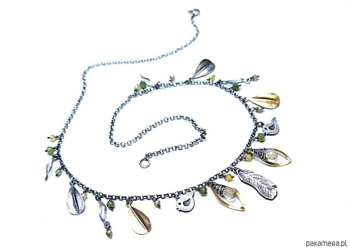 Krótki naszyjnik wykonany ze srebra i srebra pokrytego 24k złotem [pr. 925] w połączeniu z fasetowanymi kropelkami kwarców lemon [10mm], kuleczkami nefrytów [4mm], cyrkoniami [3mm] oraz srebrnymi piórkami i blaszkami. Srebro częściowo oksydowane i przetarte. Całkowita długość naszyjnika około 47,7 cm. Biżuteria ozdobnie zapakowana.