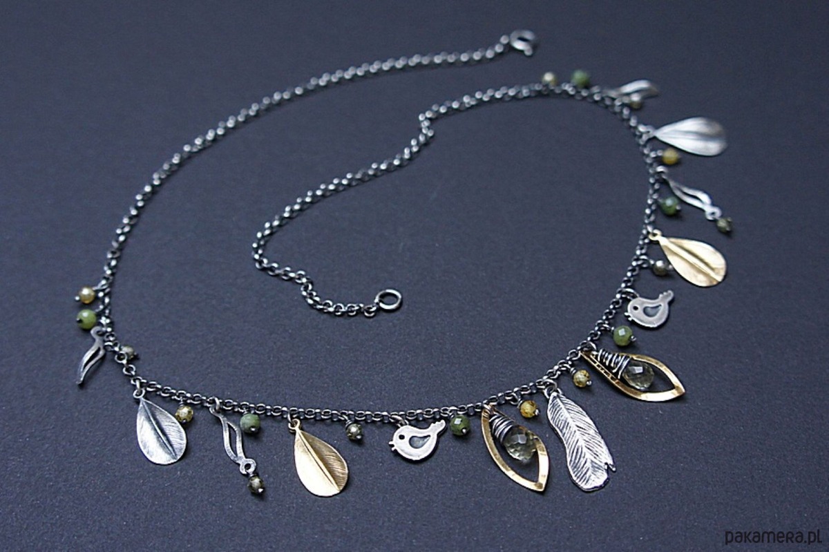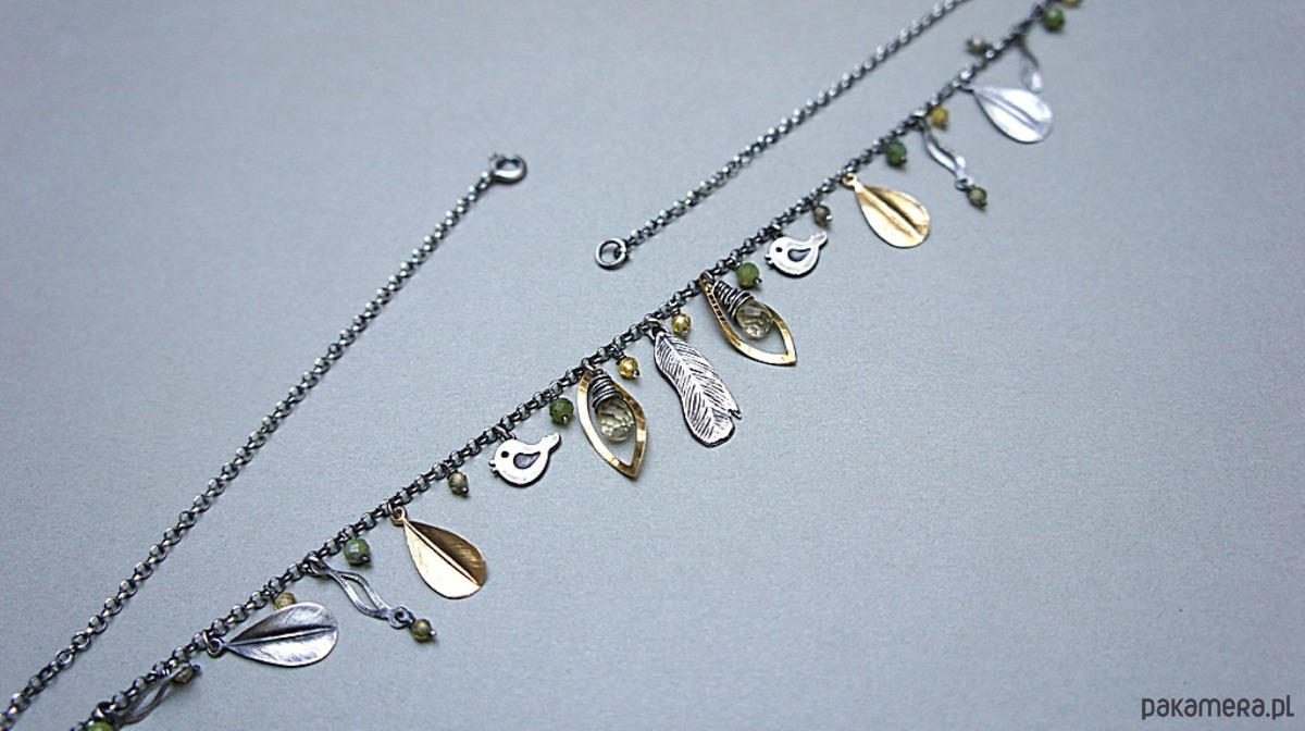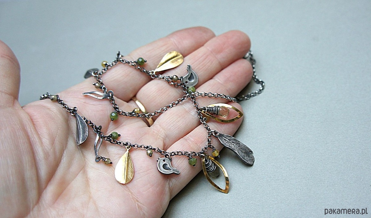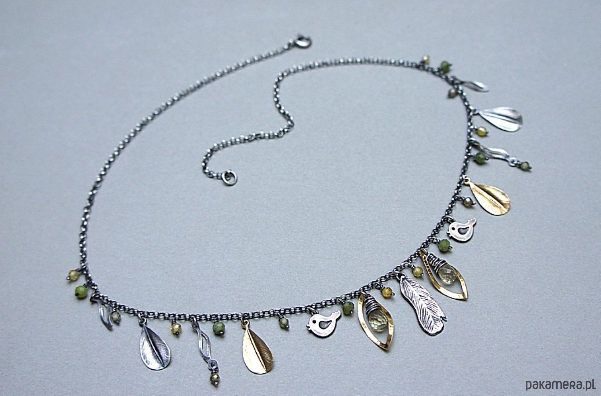 Krótki naszyjnik wykonany ze srebra i srebra pokrytego 24k złotem [pr. 925] w połączeniu z fasetowanymi kropelkami kwarców lemon [10mm], kuleczkami nefrytów [4mm], cyrkoniami [3mm] oraz srebrnymi piórkami i blaszkami. Srebro częściowo oksydowane i przetarte. Całkowita długość naszyjnika około 47,7 cm. Biżuteria ozdobnie zapakowana.