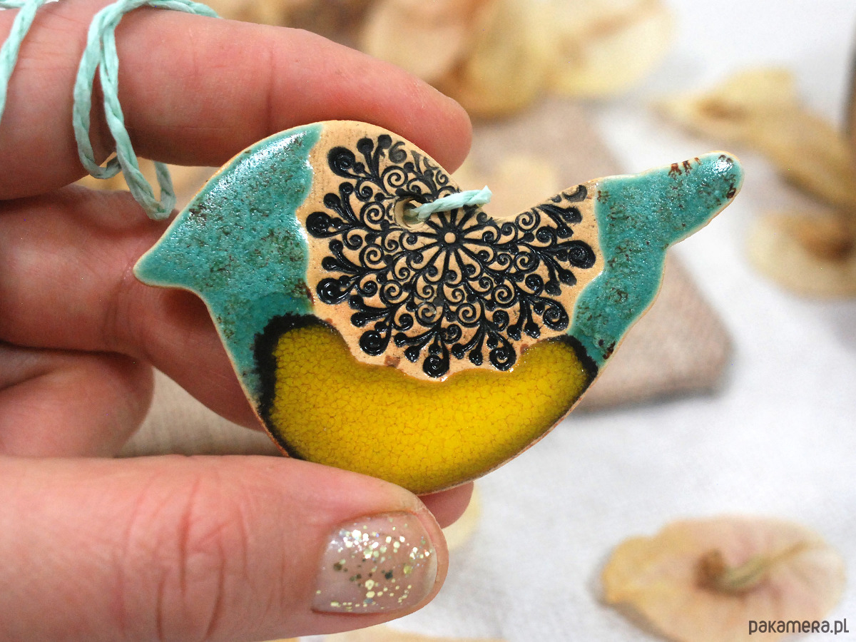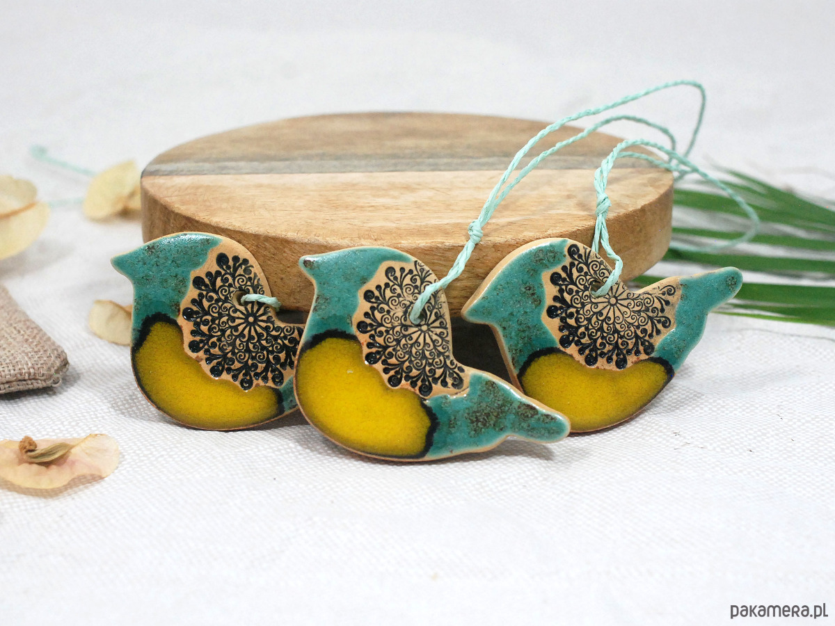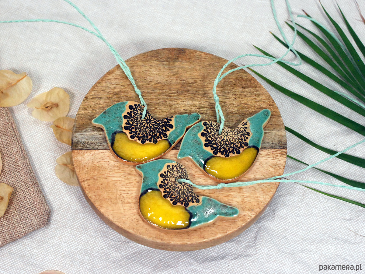 Ptasie trio z ornamentem - dekoracja ceramiczna boho