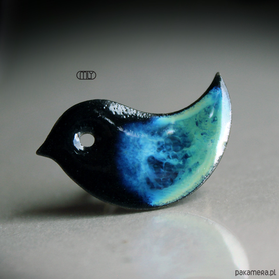 Oryginalna ceramiczna broszka, wykonana z delikatnej gliny kamionkowej, szkliwiona mieszanką czarnych i zielonych szkliw z efektem plamek, zapięcie w kolorze srebrnym. Długość ok. 4cm. Polecam
