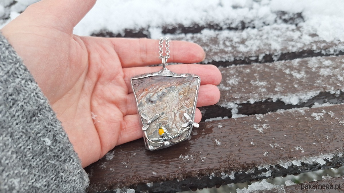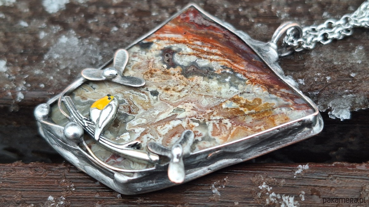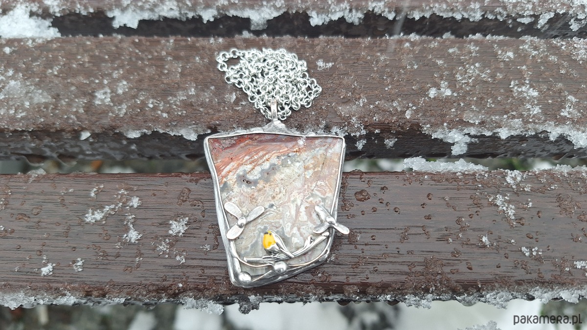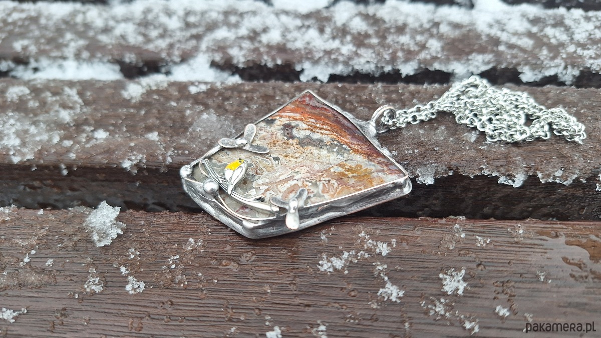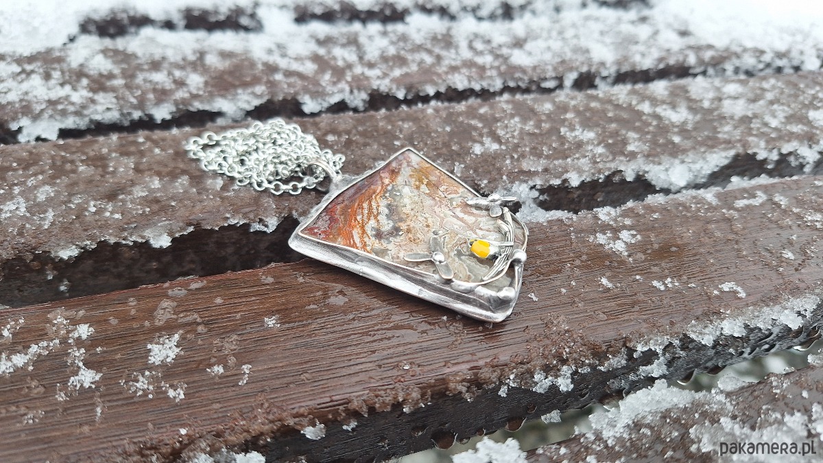 Wisiorek wykonany z miedzi, cyny i agatu. Wymiary ok. 5.5 na 4 cm. Zawieszony na łańcuszku o długości ok. 50 cm.