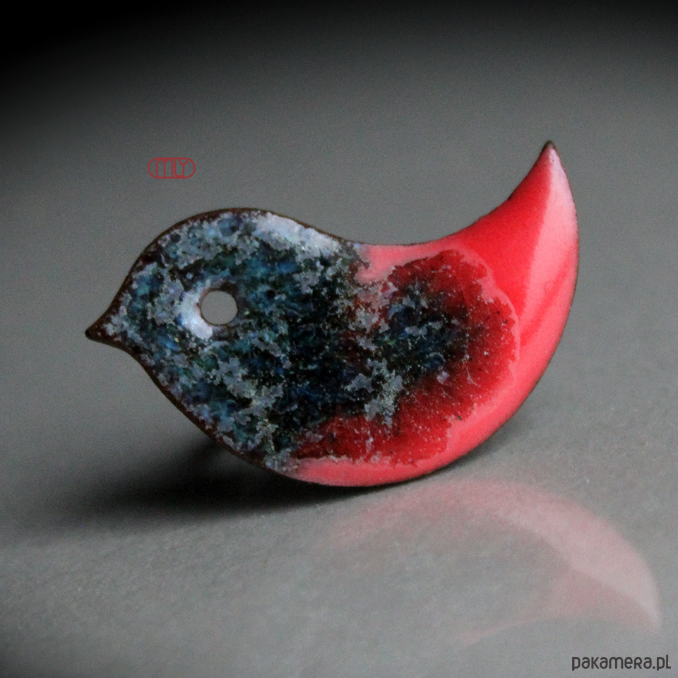 Oryginalna ceramiczna broszka, wykonana z delikatnej gliny kamionkowej, szkliwiona mieszanką zielonych i czerwonych szkliw z efektem plamek, Długość ok. 4cm. Polecam