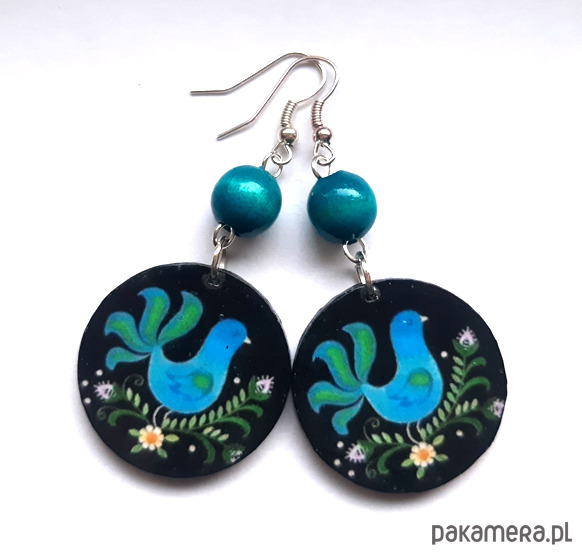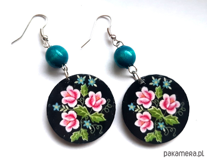 kolczyki drewniane, ozdobione metodą decoupage, dwustronne, starannie wykończone farbami akrylowymi i zabezpieczone wielokrotnie lakierem, koraliki drewniane, bigle posrebrzane, długość kolczyków bez bigli: 5 cm, średnica: 3 cm, bardzo lekkie