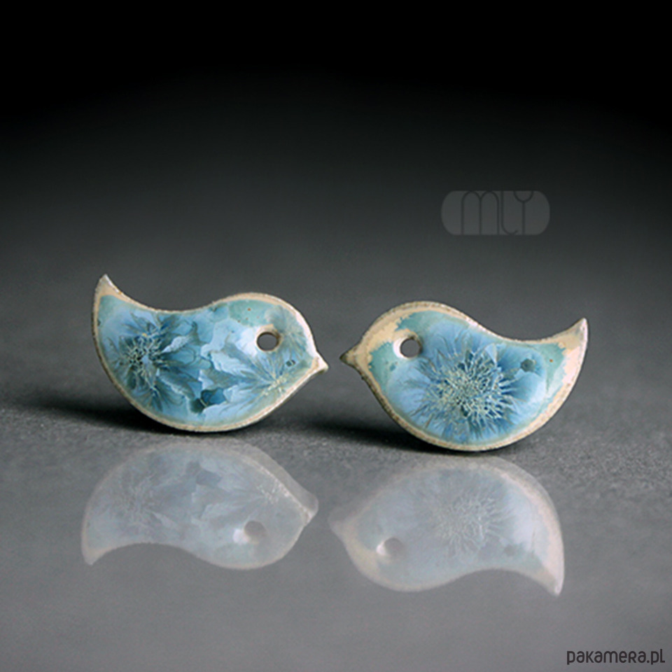 Efektowne kolczyki w formie sztyftów, ręcznie wykonane z delikatnej kamionki, jednostronnie szkliwione mieszanką kremowych i błękitnych szkliw z efektem plamek, na antyalergicznych sztyftach w kolorze srebrnym.długość elementu ceramicznego ok. 17mm, Polecam
