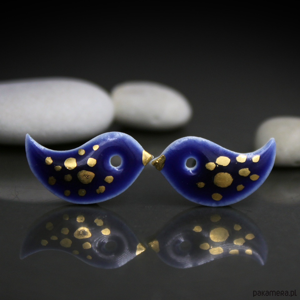 Efektowne kolczyki w formie sztyftów, ręcznie wykonane z delikatnej śnieżnobiałej porcelany, jednostronnie szkliwione kobaltowym seladonowym szkliwem i dekorowane złotem naszkliwnym, na antyalergicznych sztyftach w kolorze srebrnym.długość elementu ceramicznego ok. 17mm, Polecam