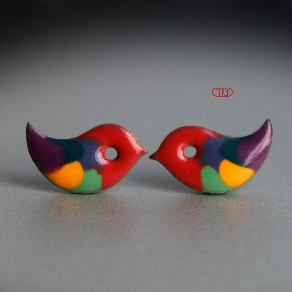 Efektowne kolczyki w formie sztyftów, ręcznie wykonane z delikatnej kamionki jednostronnie szkliwione mieszanką kolorowych szkliw z efektem plamek, na antyalergicznych sztyftach w kolorze srebrnym.długość elementu ceramicznego ok. 17mm, Polecam
