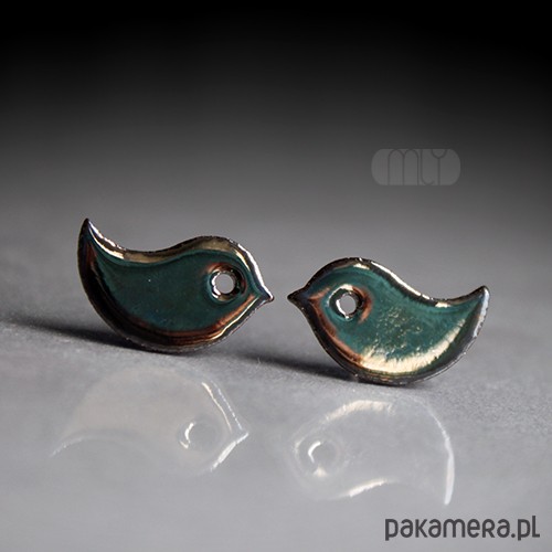Efektowne kolczyki w formie sztyftów, ręcznie wykonane z delikatnej kamionki, jednostronnie szkliwione mieszanką stalowo srebrzystych szkliw z efektem plamek, na antyalergicznych sztyftach w kolorze srebrnym.długość elementu ceramicznego ok. 17mm, Polecam