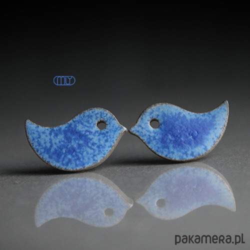 Efektowne kolczyki w formie sztyftów, ręcznie wykonane z delikatnej kamionki, jednostronnie szkliwione mieszanką błękitnych szkliw z efektem plamek, na antyalergicznych sztyftach w kolorze srebrnym.długość elementu ceramicznego ok. 17mm, Polecam