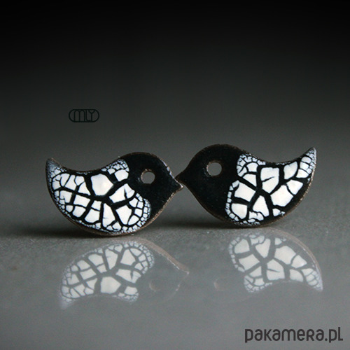 Efektowne kolczyki w formie sztyftów, ręcznie wykonane z delikatnej kamionki, jednostronnie szkliwione mieszanką białych i granatowych szkliw z efektem plamek, na antyalergicznych sztyftach w kolorze srebrnym.długość elementu ceramicznego ok. 17mm, wykonywane na zamówienie - rozmieszczenie spękań może nieznacznie różnić się od widocznego na zdjęciu.Polecam