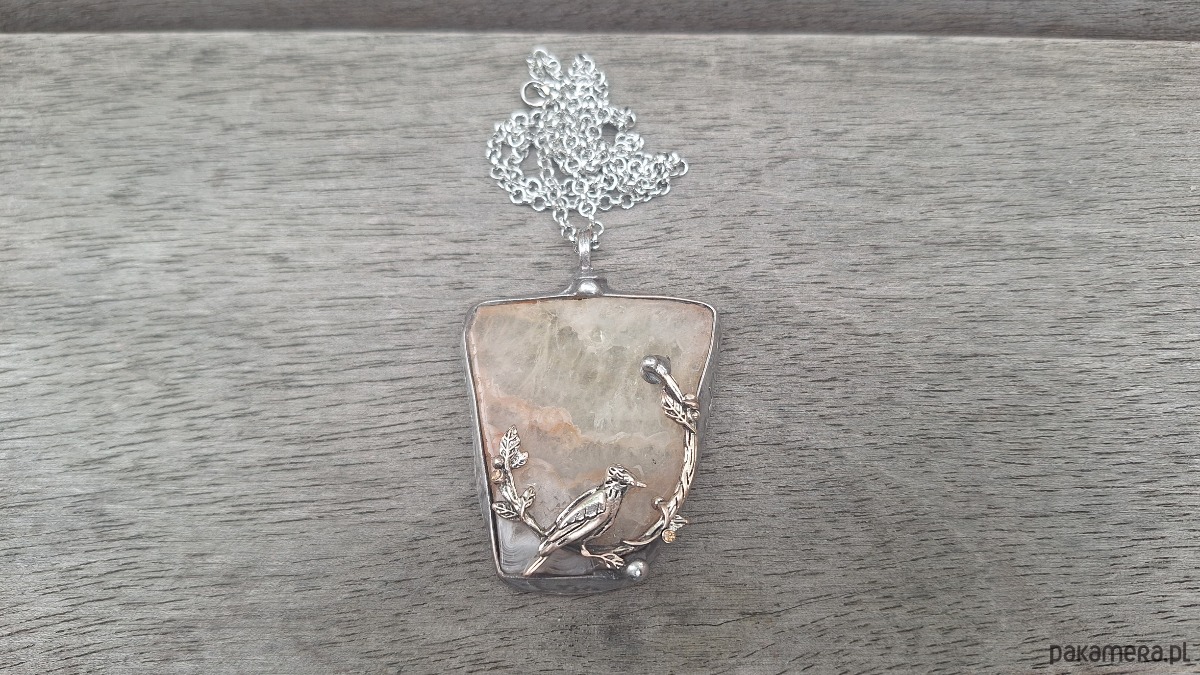 Wisiorek wykonany z miedzi, cyny i agatu. Wymiary ok. 5 na 4 cm. Zawieszony na łańcuszku o długości ok. 50 cm.