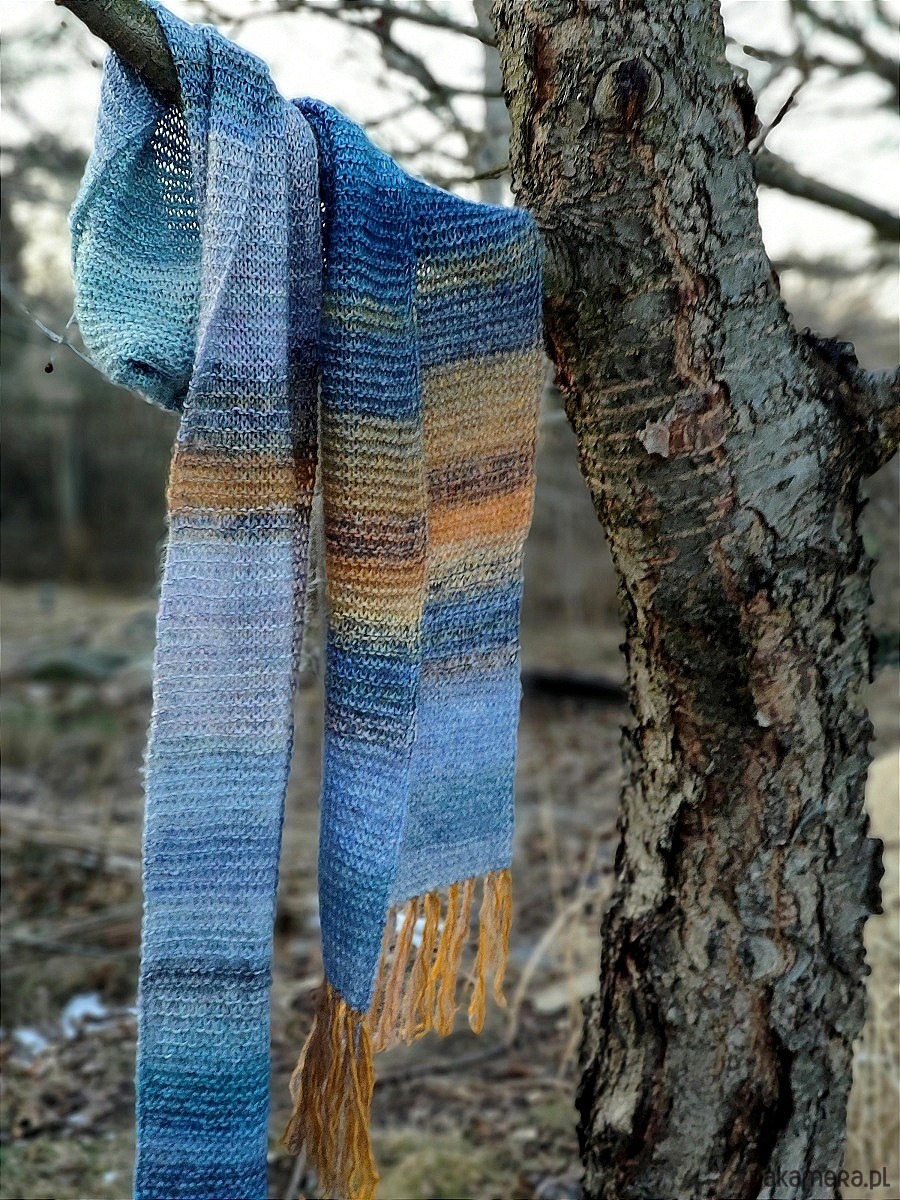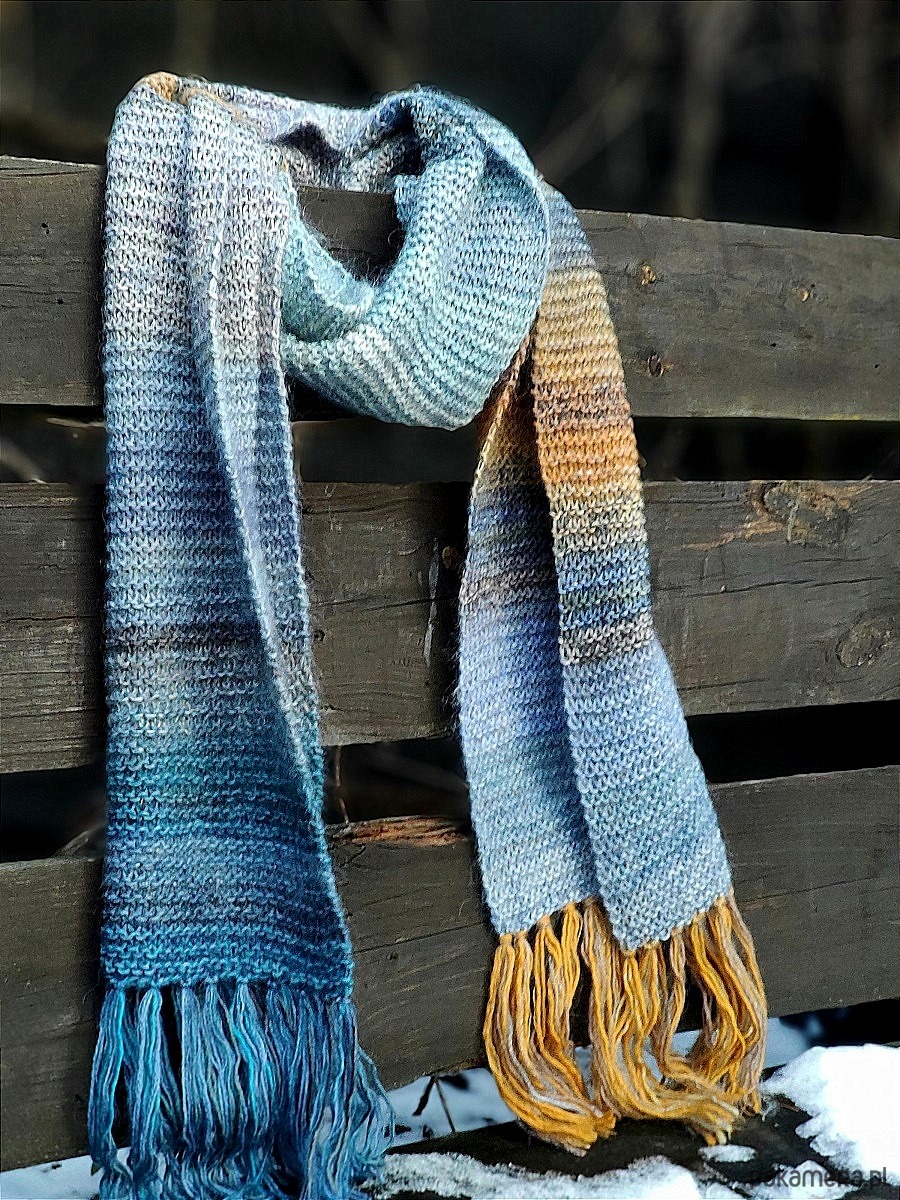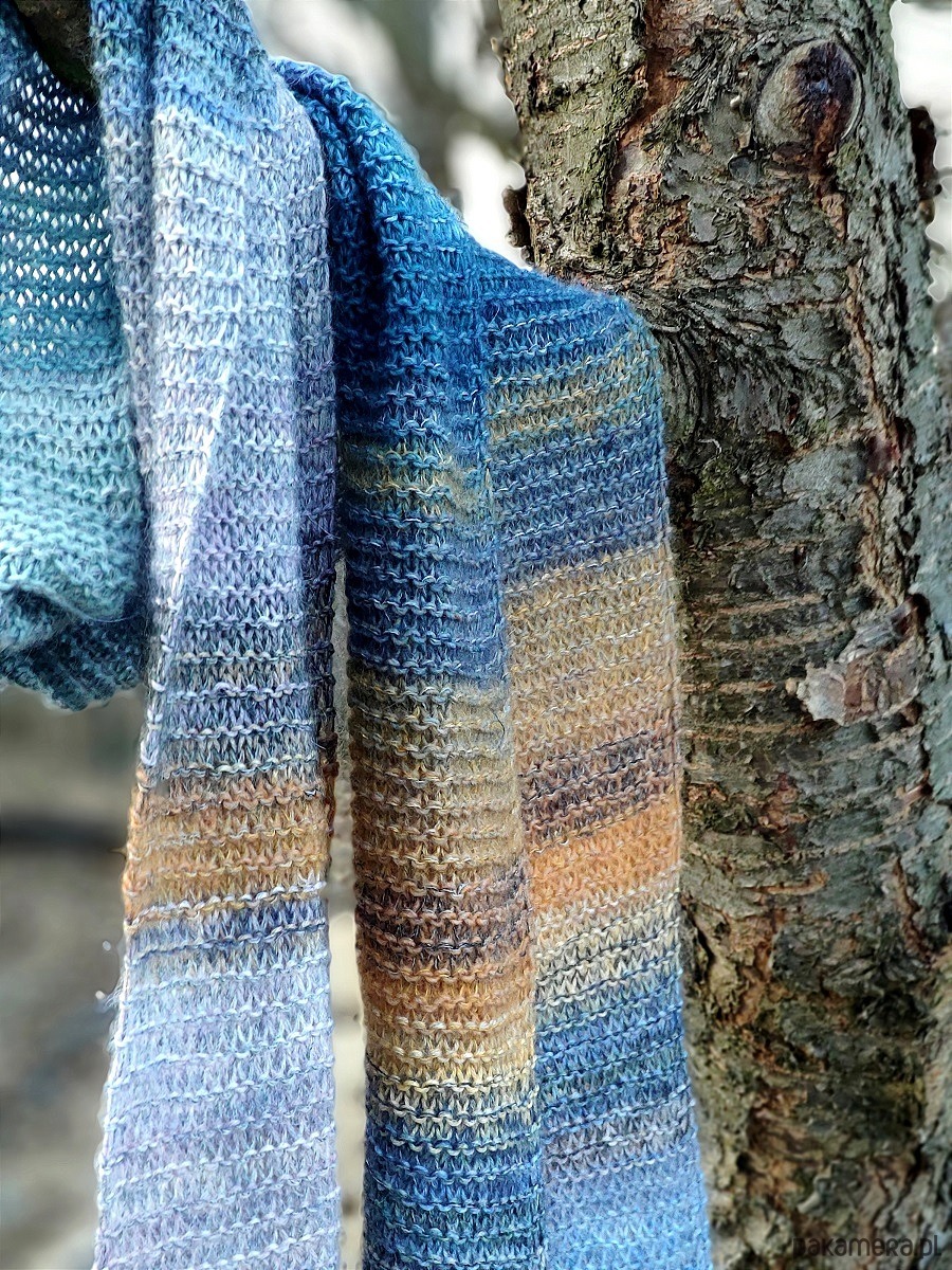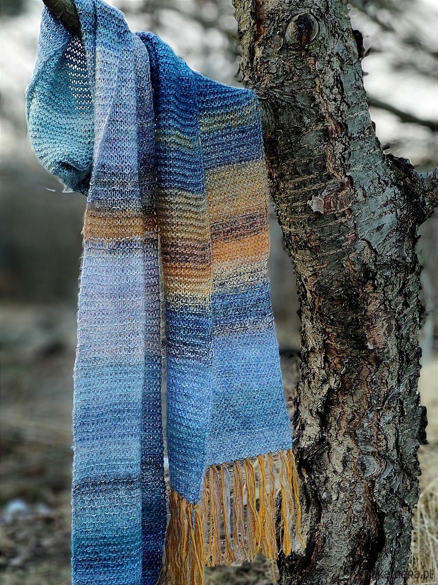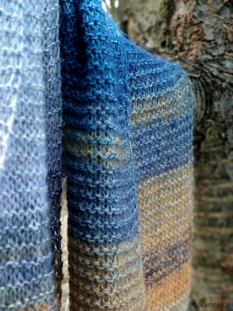 Można się nim otulić! Lekki, miękki i ciepły szal- długi i szeroki. Połączyłam puchatą i miękką włóczkę ( 70% moher, 30% jedwab) z merynosem, włókna sztuczne poniżej 5%. Przepiękne melanże w ombre...
