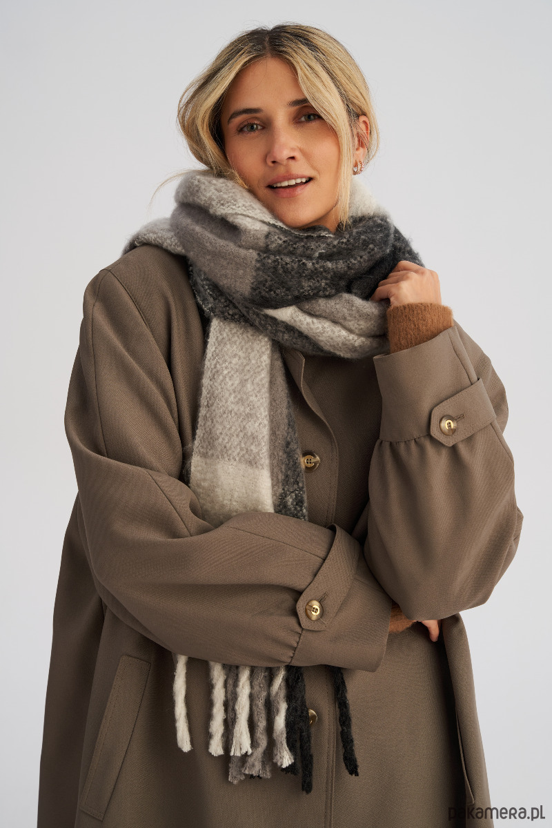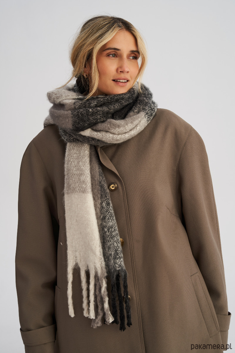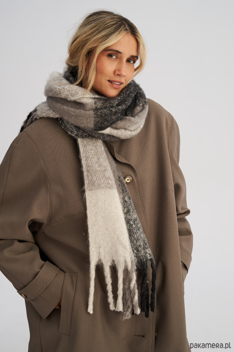 Miękki i puszysty szalik w kratę to idealne połączenie stylu i wygody. Wykonany z poliestru z recyklingu, jest przyjemny w dotyku i zapewnia komfort w chłodne dni. Jego długość pozwala swobodnie owinąć się wokół szyi, a wzór w dużą kratę dodaje elegancji i modnego charakteru.