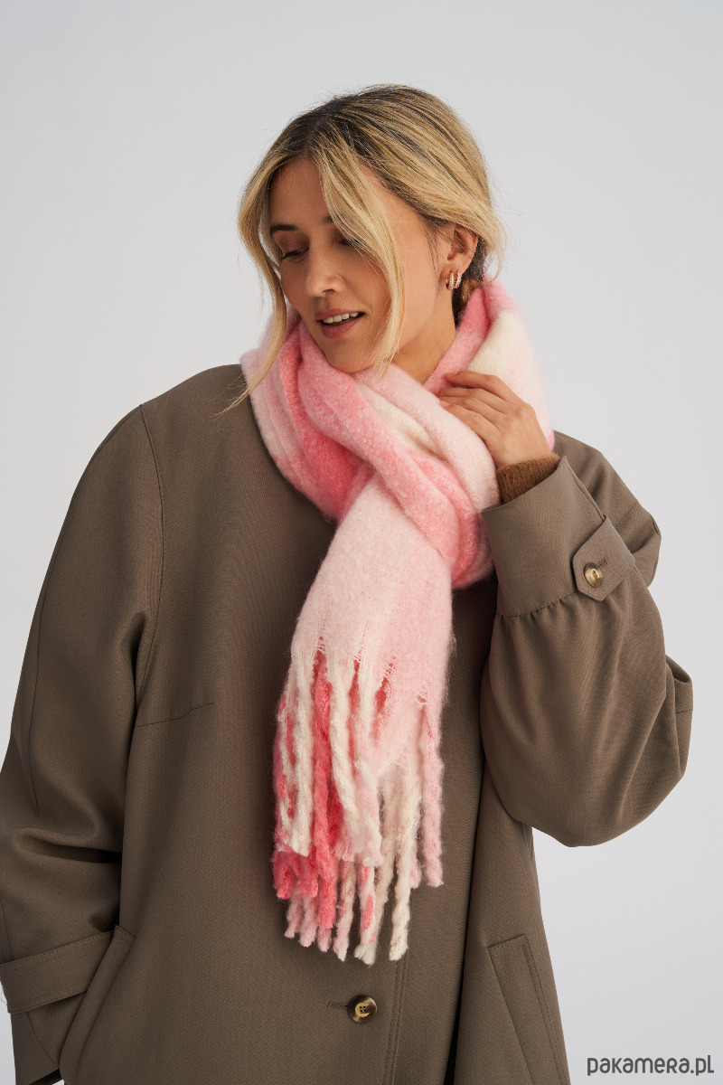 Wykończenie frędzlami podkreśla swobodny styl, a mała metka to subtelny detal. Szalik świetnie sprawdzi się zarówno do codziennych, jak i bardziej eleganckich jesienno-zimowych outfitów.