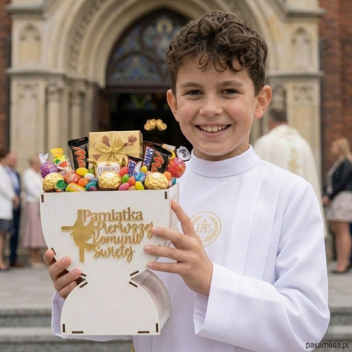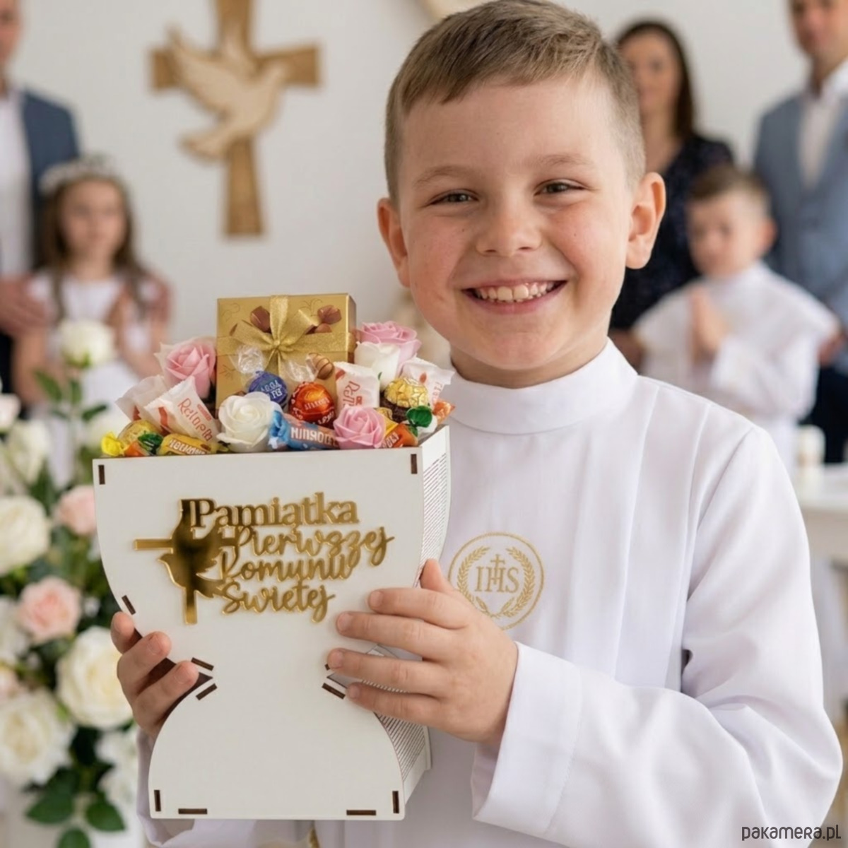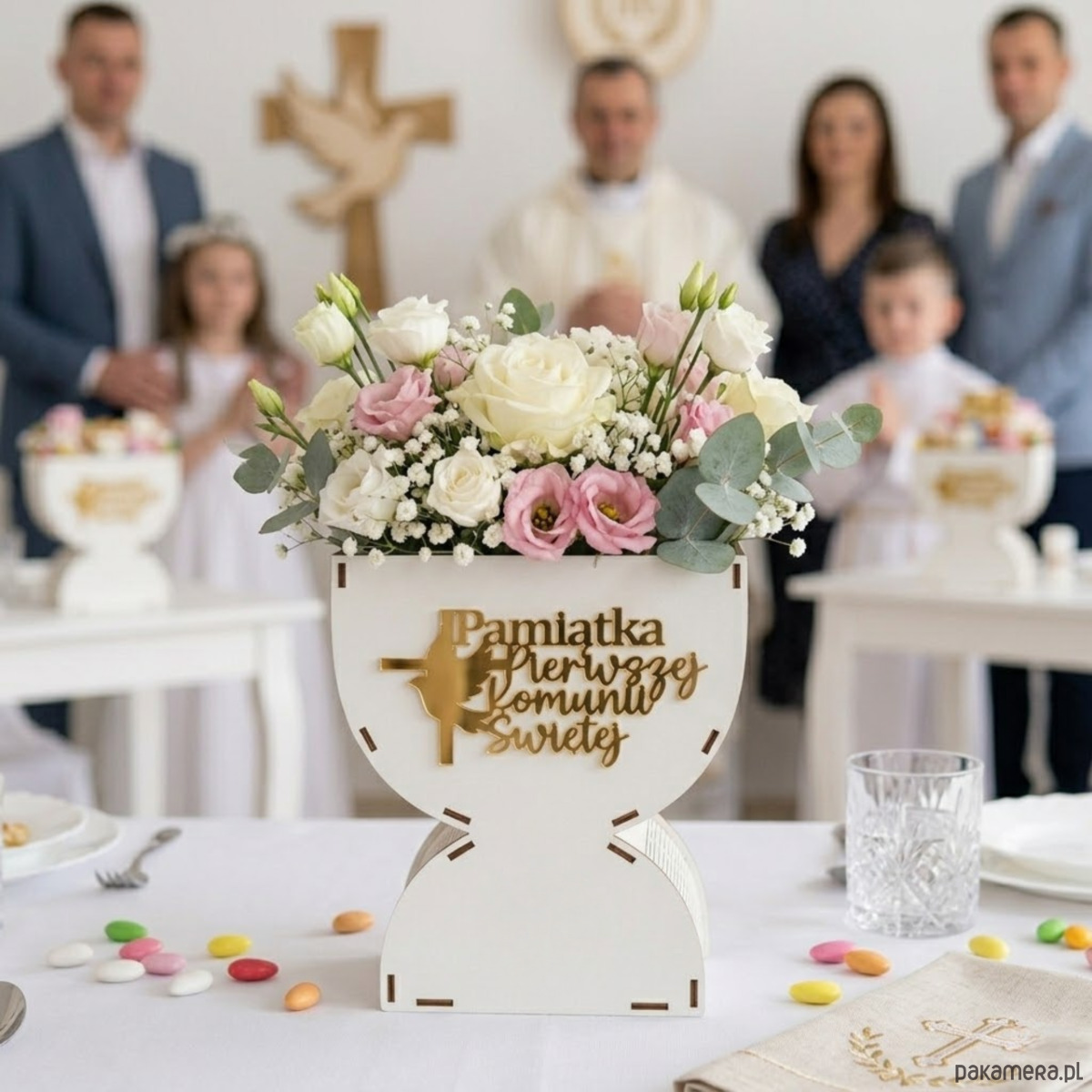 Eleganckie pudełko w kształcie kielicha wykonane z białej płyty HDF oraz dekoracyjnych elementów ze złotego lustrzanego plexi to wyjątkowa propozycja na Pierwszą Komunię Świętą. Połączenie bieli i złota nadaje mu uroczysty, luksusowy charakter, idealny na tak ważną okazję.To nie tylko dekoracja, ale również praktyczne pudełko na prezent lub słodycze, które pięknie uzupełnia komunijną aranżację stołu.