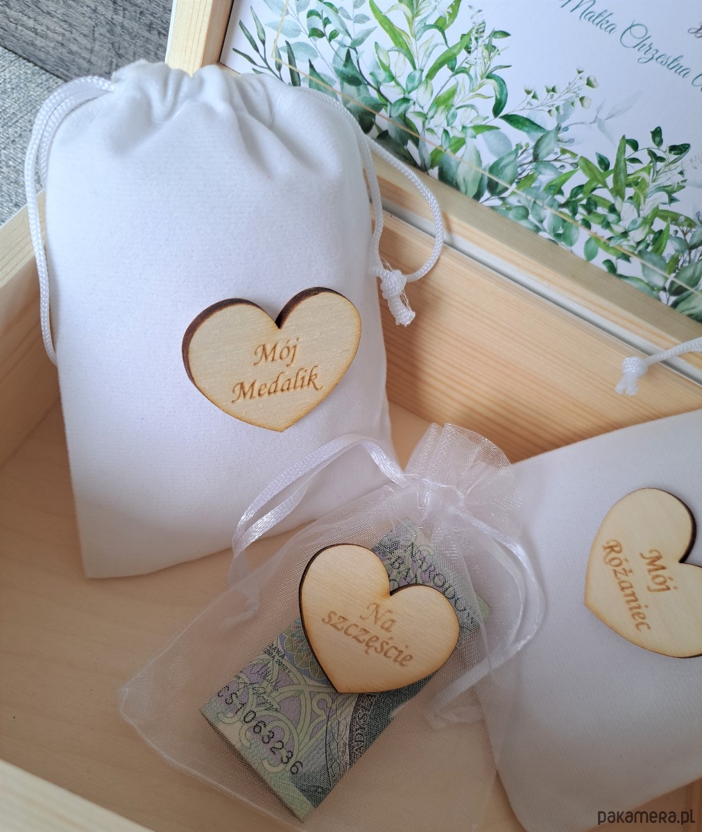 W pudełku umieszczone zostały 3 woreczki, do których przymocowane zostały malutkie serduszka z napisami: "na szczęście" "mój różaniec", "mój medalik". Woreczki przeznaczone są do przechowywanie pamiątek komunijnych takich jak różaniec, medalik czy też pieniądze. Ponadto w elegancki sposób można przekazać pieniądze umieszczając je w woreczku z organzy z napisem " na szczęście".