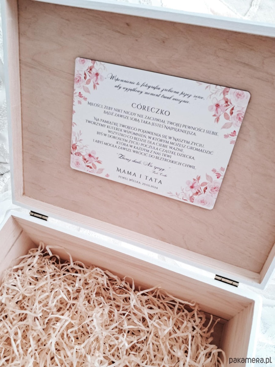 Możemy wykonać pudełko według Twojego pomysłu, umieścić dopiski, cytaty daty, metryczkę.