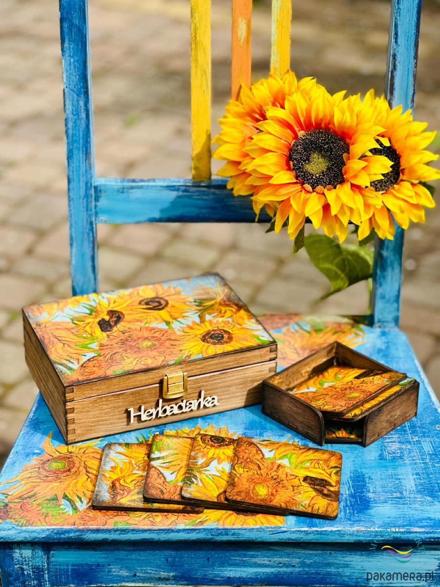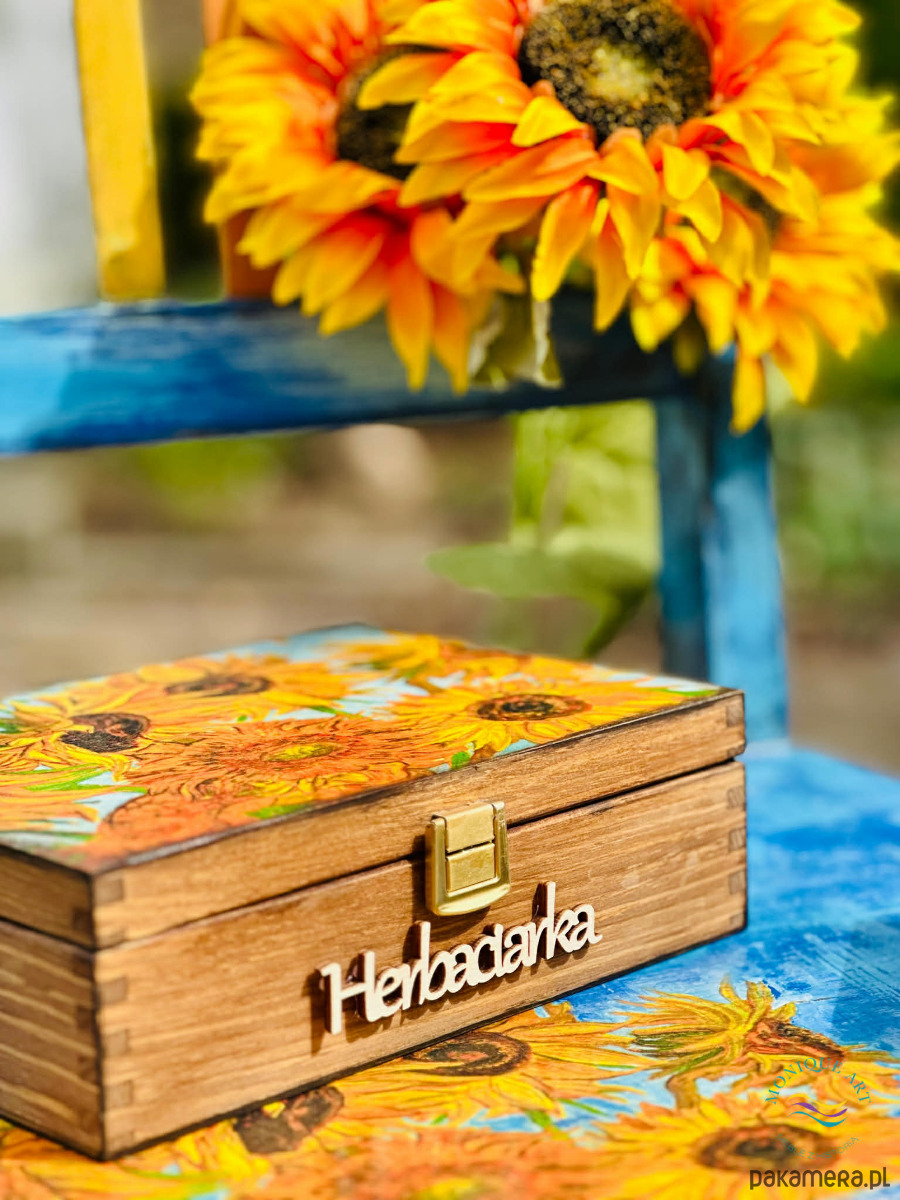 Pudełko na herbatę, motyw słoneczników, prezent dla miłośnika sztuki