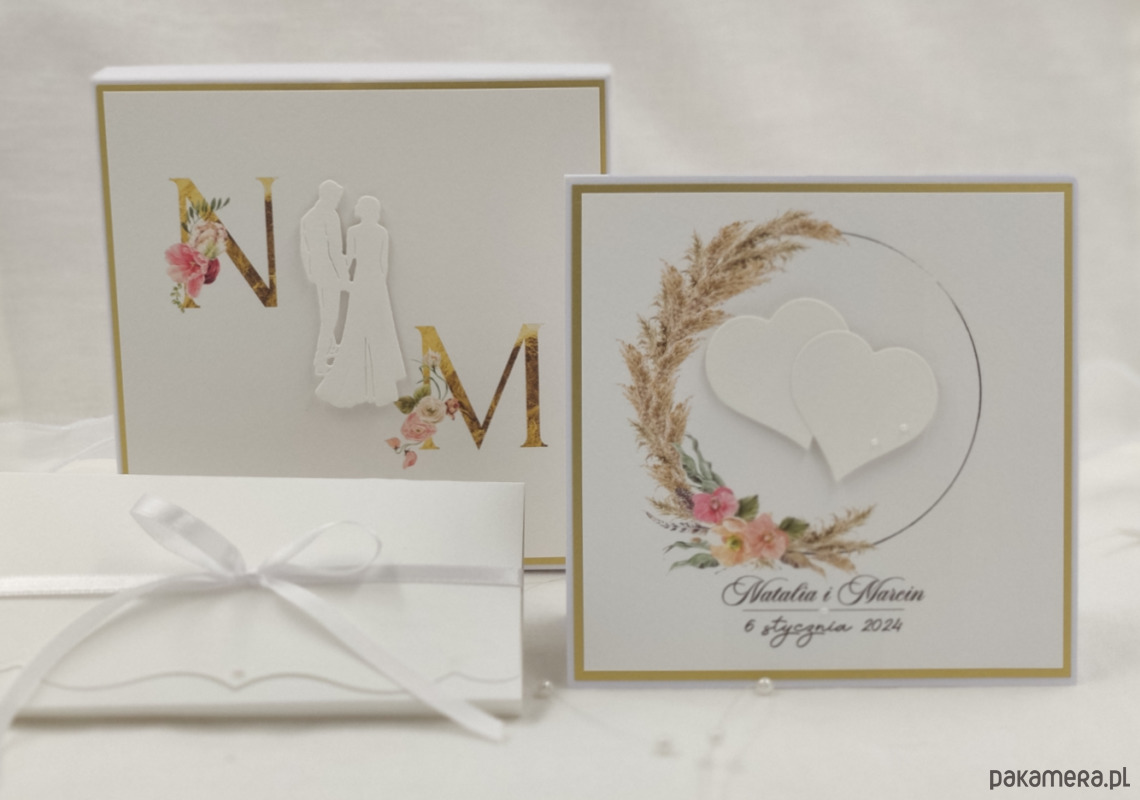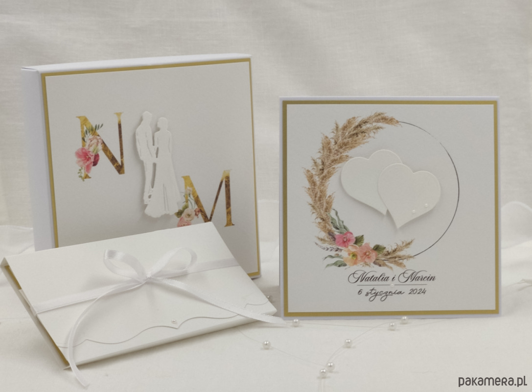 To zestawienie wyjątkowego, włoskiego papieru w odcieniu delikatnej, śmietankowej bieli oraz wykończeń w odcieniu matowego złota. Ozdobionych ręcznie wyciętymi elementami z dodatkiem alabastrowych perełek lub delikatnych cyrkonii.
