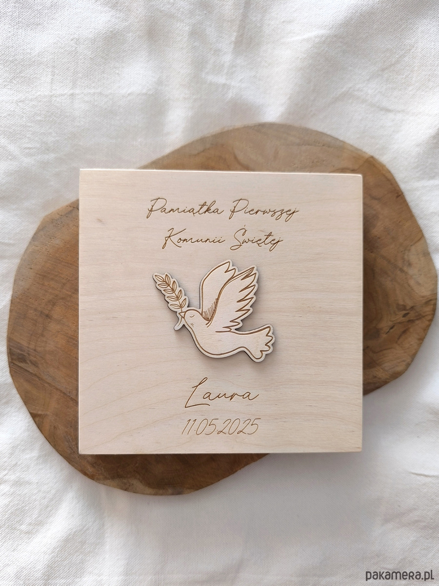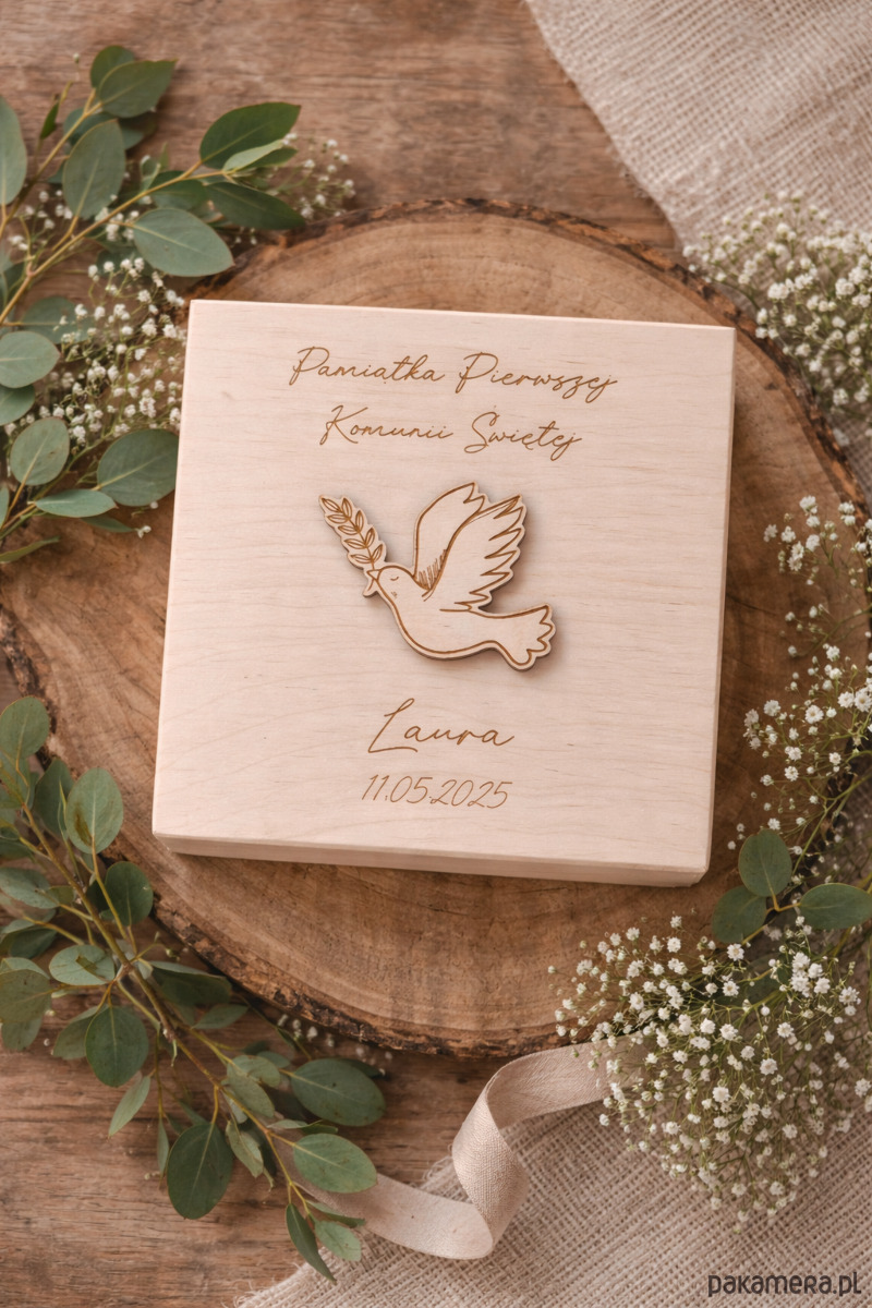 Personalizowane pudełko na pieniądze z okazji I Komunii Świętej z motywem Gołębicy