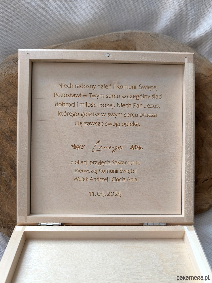 Pudełko zawiera grawer na wieczku oraz możliwość graweru z życzeniami i dedykacją pod wieczkiem.