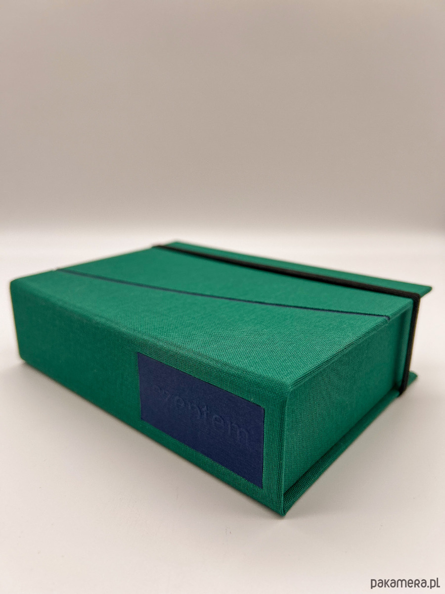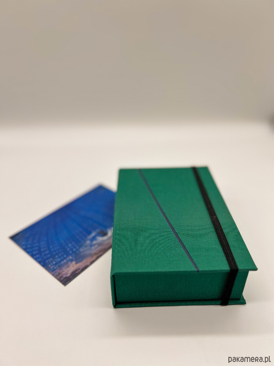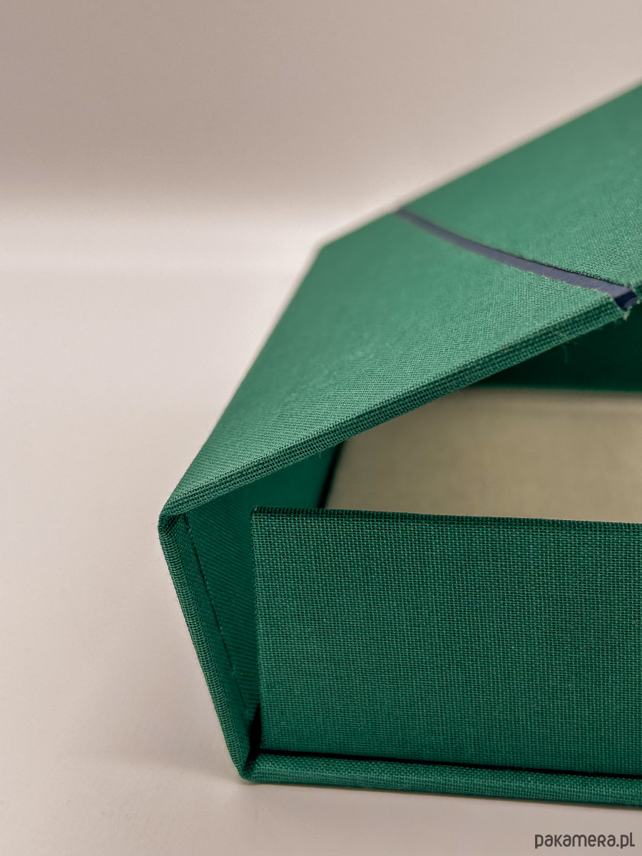 Pudełko zostało oprawione w tkaninę introligatorską i papier. Całość zamykana jest na gumkę, dzięki czemu pudełko pozostaje zwarte i bezpieczne w użytkowaniu.
