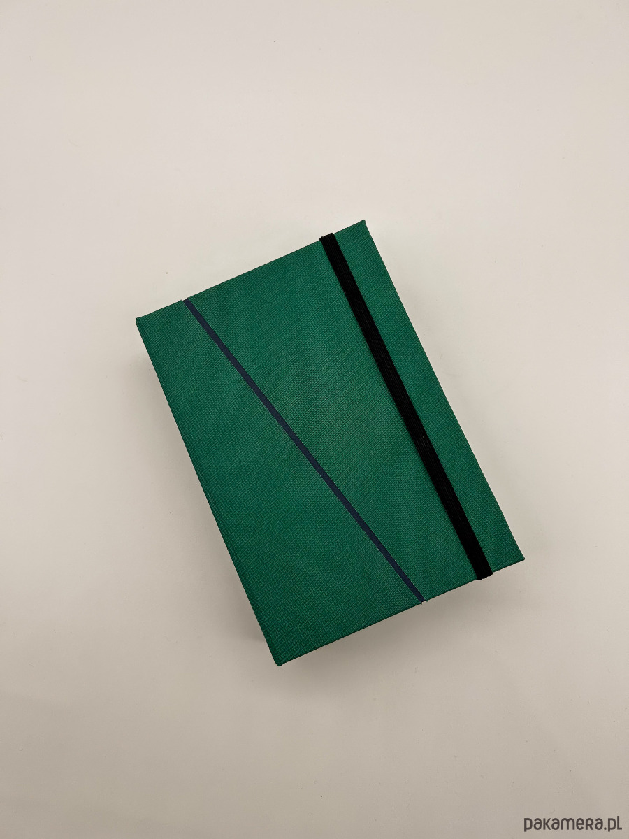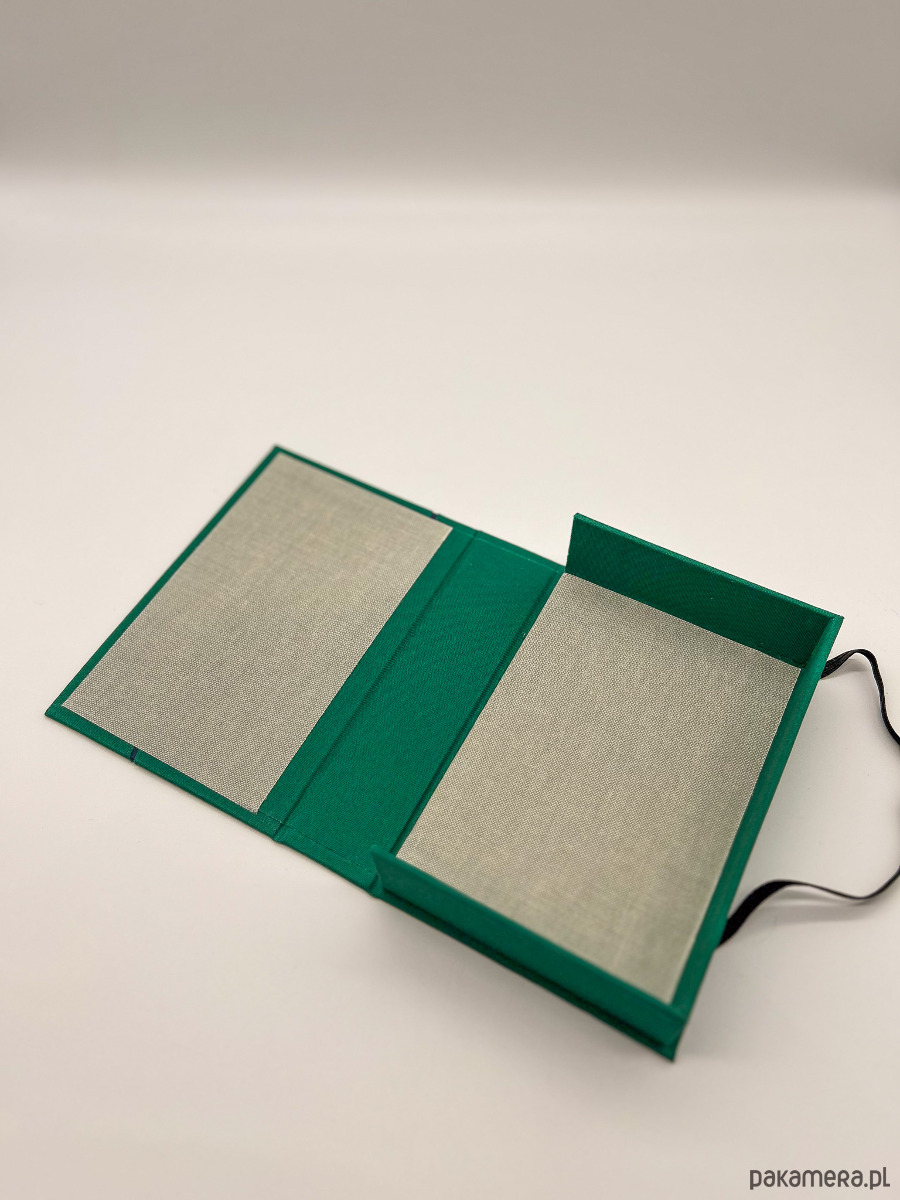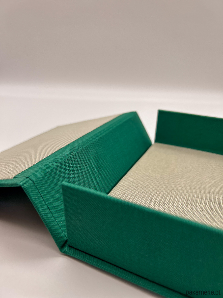 Pudełko zostało oprawione w tkaninę introligatorską i papier. Całość zamykana jest na gumkę, dzięki czemu pudełko pozostaje zwarte i bezpieczne w użytkowaniu.