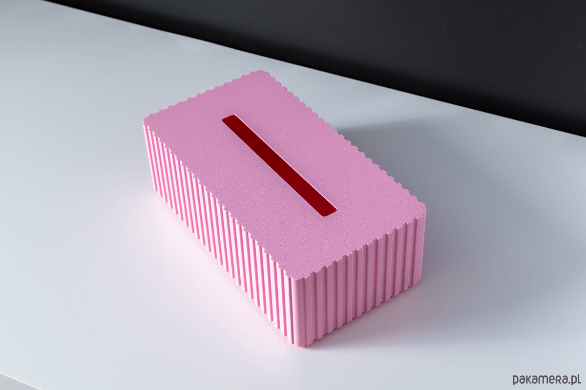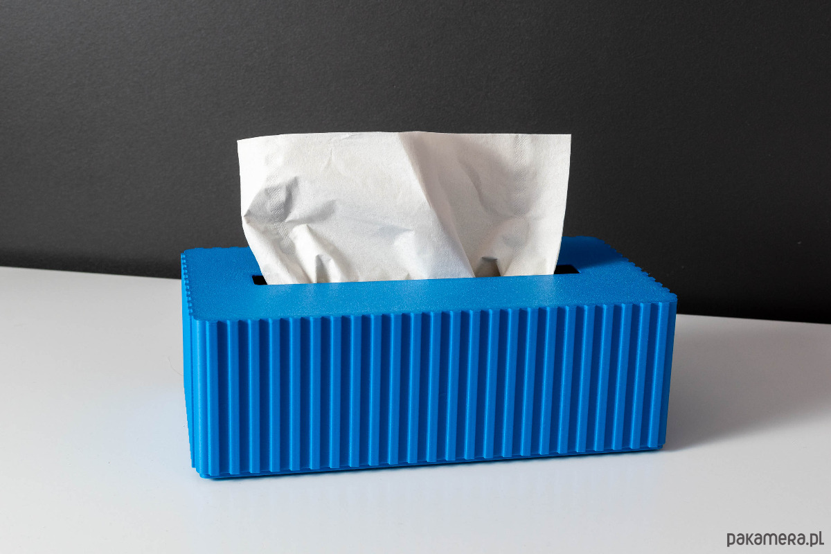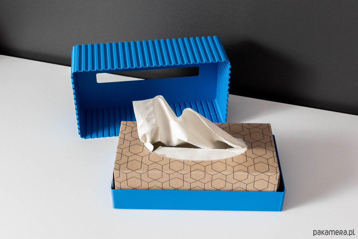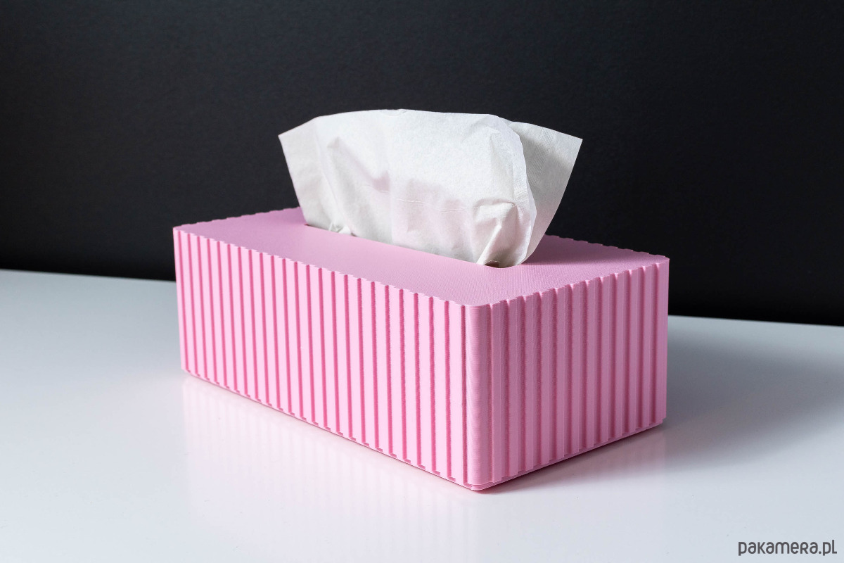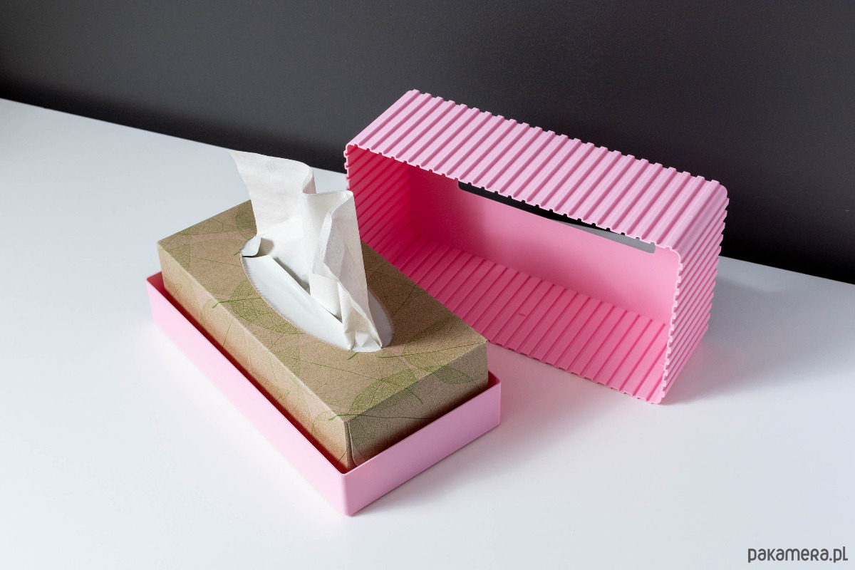 Pudełko ozdobne na chusteczki wykonane w całości w technologii druku 3D. Nie jest to tylko osłonka na oryginalne pudełko z chusteczkami. Podstawa oraz osłona, całość pozwala ukryć zawartość, ale także ułatwia przenoszenie bez ryzyka wysunięcia się zawartości.