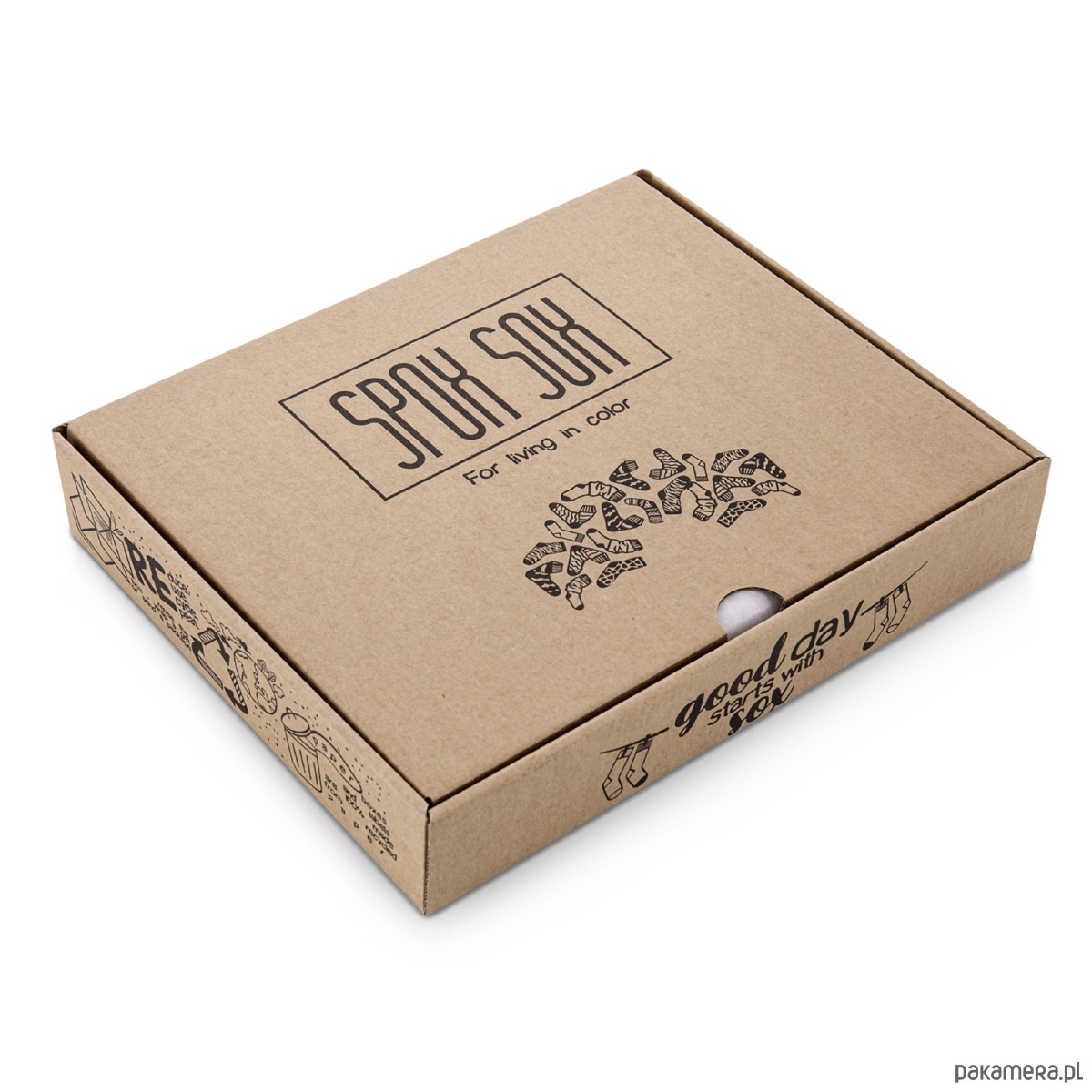 Jednak czym byłby prezent bez odpowiedniego opakowania? W końcu otwieranie pudełka niespodzianki, to jedna z najprzyjemniejszych dla nas chwil! Z tej właśnie okazji stworzyliśmy specjalne ekologiczne pudełko prezentowe - w neutralnym kolorze, z małą skarpetkową łamigłówką na odwrocie.