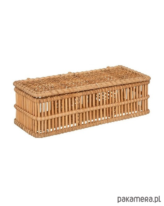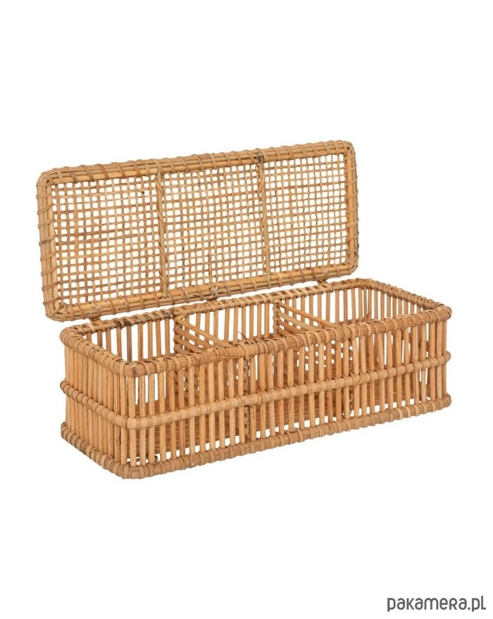 Ciekawe pudełko wykonane z plecionego rattanu. Naturalne. Wewnątrz posiada trzy przegrody.