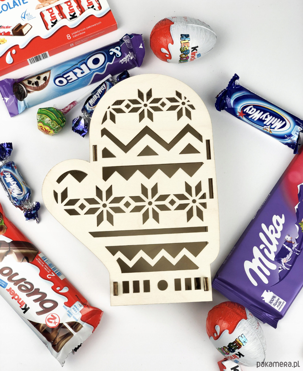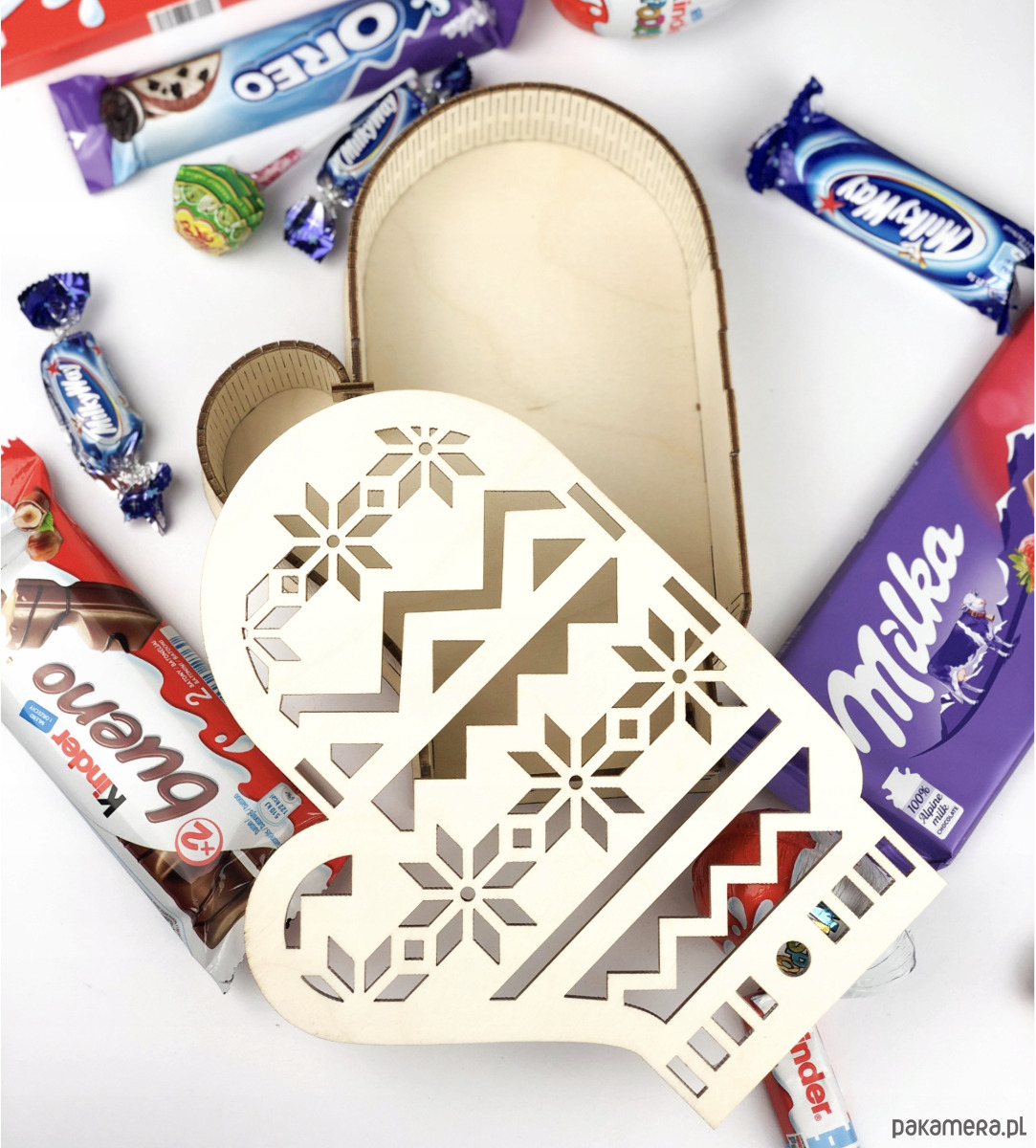 Rękawica ma kształt klasycznej zimowej łapawicy i została precyzyjnie wycięta laserowo, dzięki czemu prezentuje się niezwykle elegancko i świątecznie. Można w niej umieścić słodycze, drobiazgi, kosmetyki lub małe prezenty, tworząc własny, spersonalizowany zestaw świąteczny.
