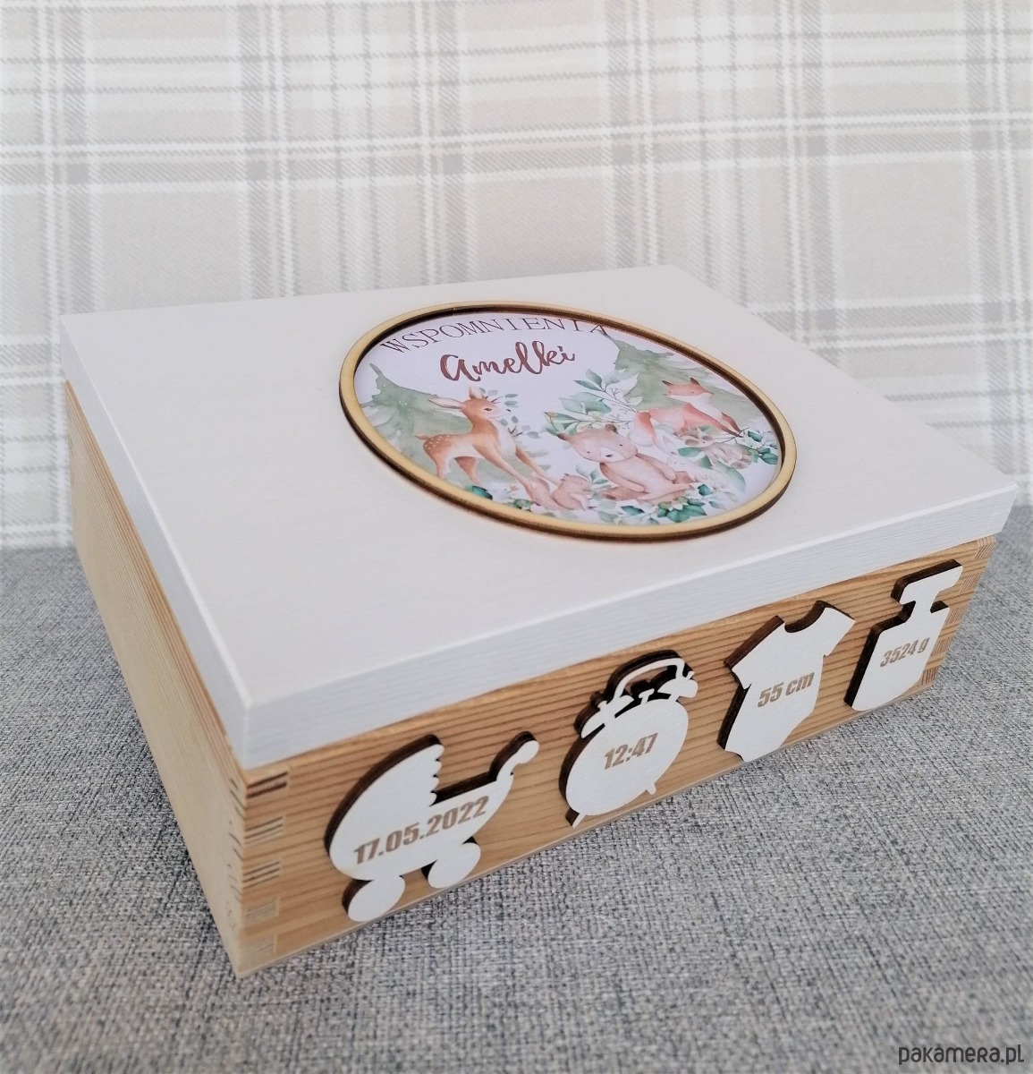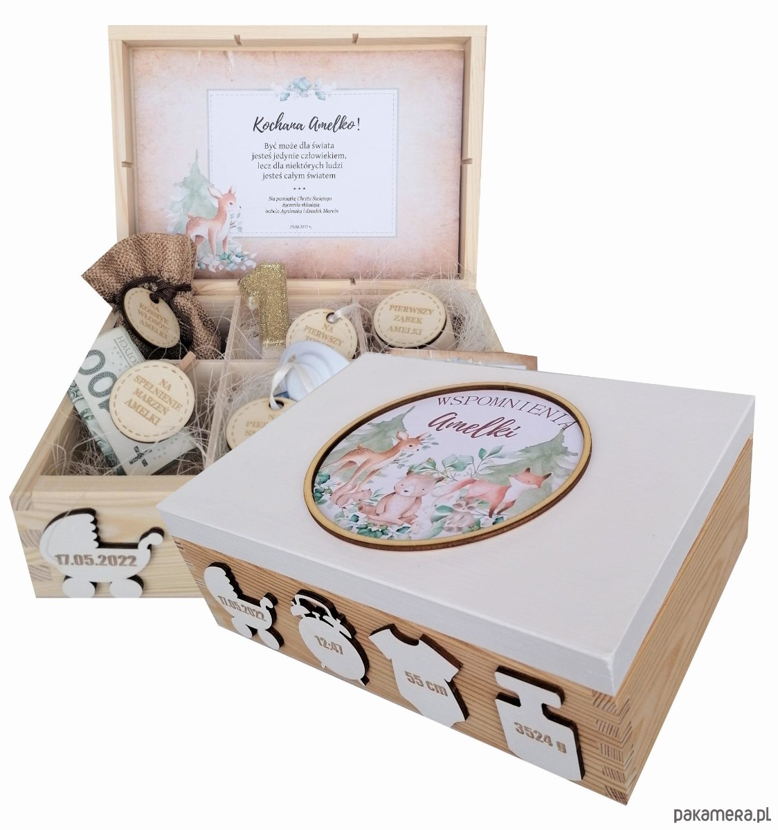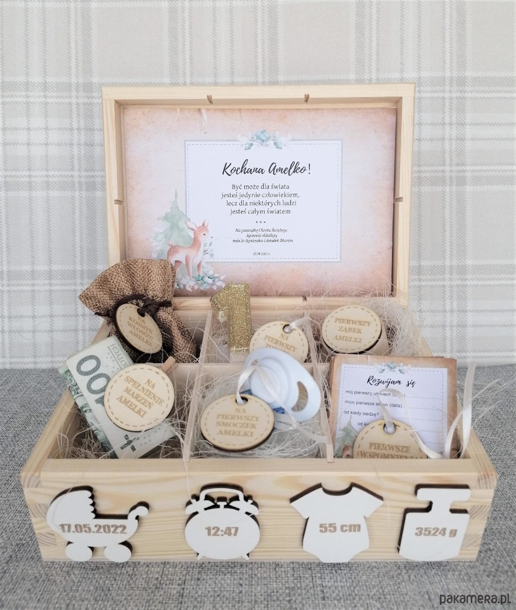 Drewniane, ręcznie malowane pudełko, które będzie wyjątkowym i oryginalnym prezentem dla nowonarodzonego maleństwa.