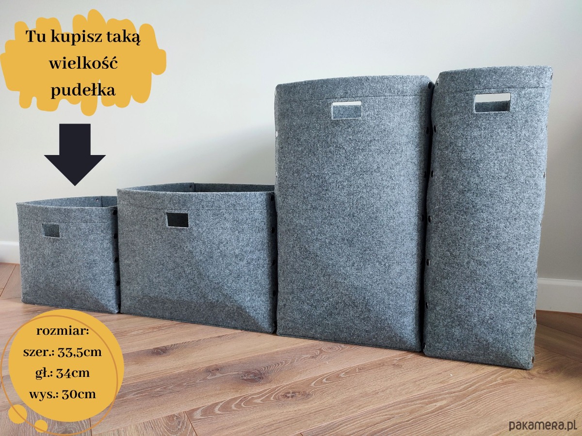 Wymiary pudełka: szerokość 33,5 cm, długość 34cm, wysokość 30 cm.
