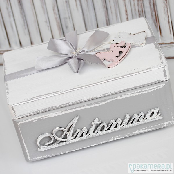 Zamykana drewniana skrzynka w szarościach, ozdobiona imieniem, to doskonały pomysł na schowanie skarbów naszego dziecka lub np. wszystkich drobiazgów, których potrzebujemy do jego codziennej pielęgnacji. Pudełko posiada z boku otwory, co ułatwia jego przenoszenie. Oprócz walorów praktycznych spełnia rolę ciekawej dekoracji pokoju. Szczegóły do uzgodnienia Można zamówić pudełko bez imienia Wymiar: 300x200x140