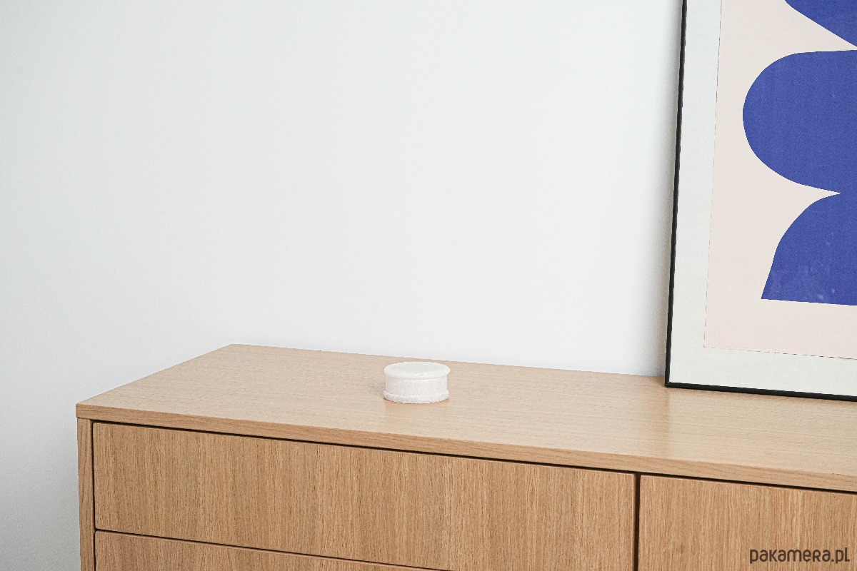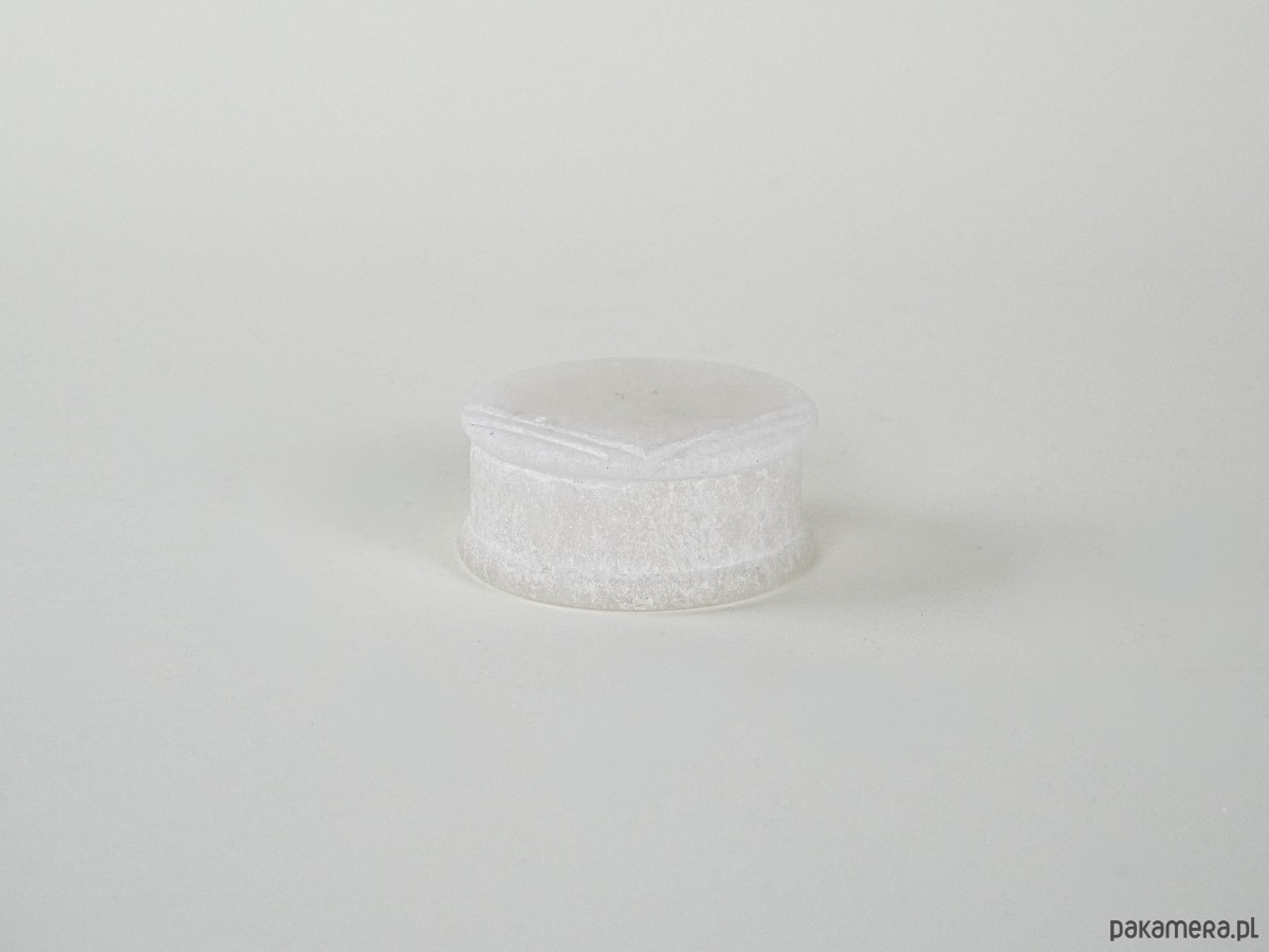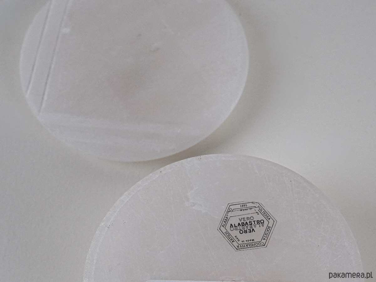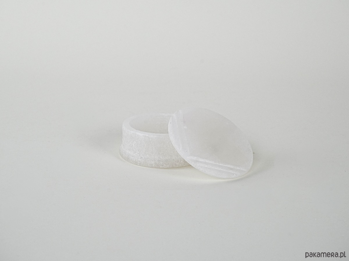 Okrągłe pudełko wykonane z jasnego, naturalnego kamienia – najpewniej alabastru lub onyksu – o delikatnej, strukturze i subtelnych przejściach kolorystycznych od bieli po lekki krem. Wieczko idealnie dopasowane do korpusu. Całość ręcznie szlifowana i polerowana, matowa, co podkreśla naturalne rysunki kamienia.