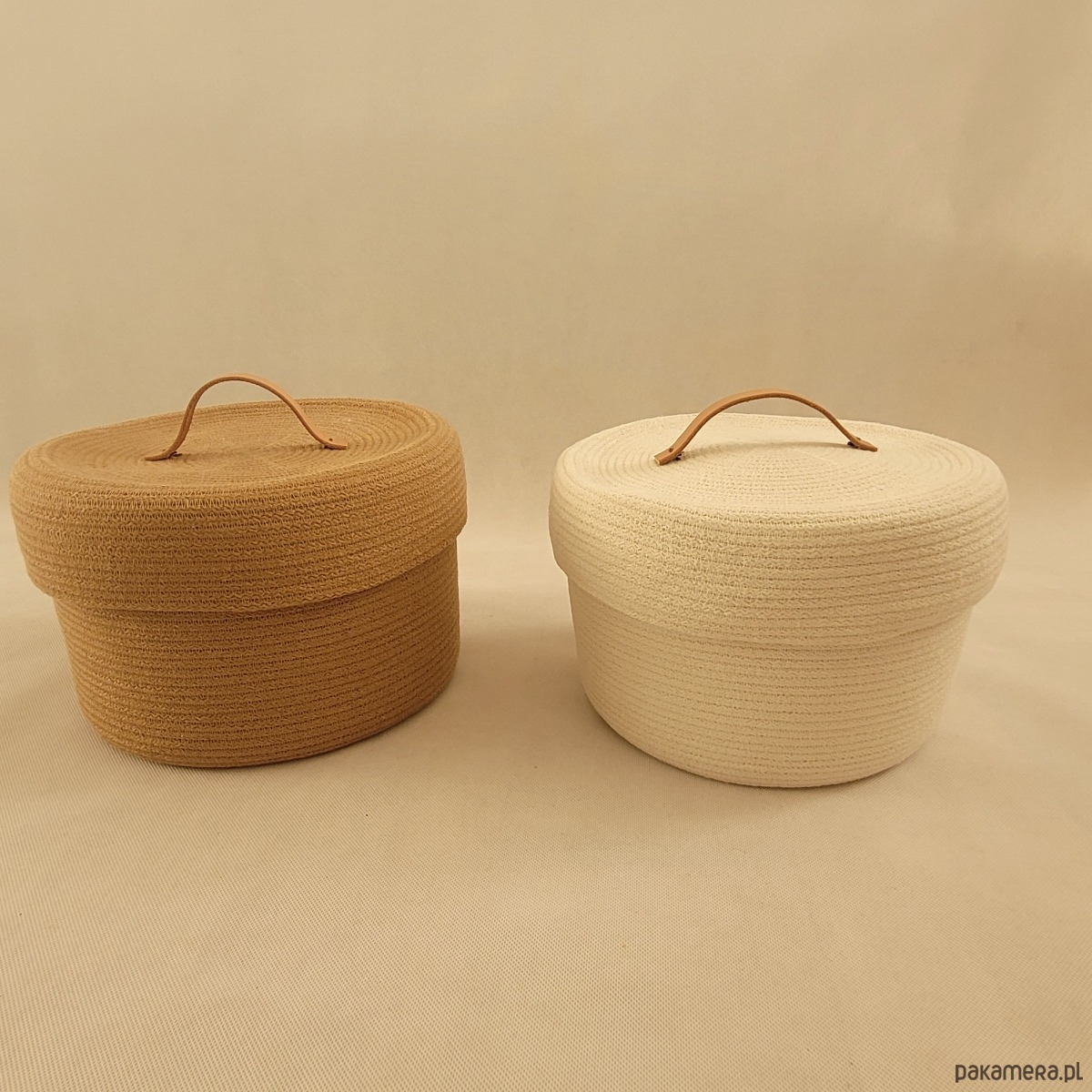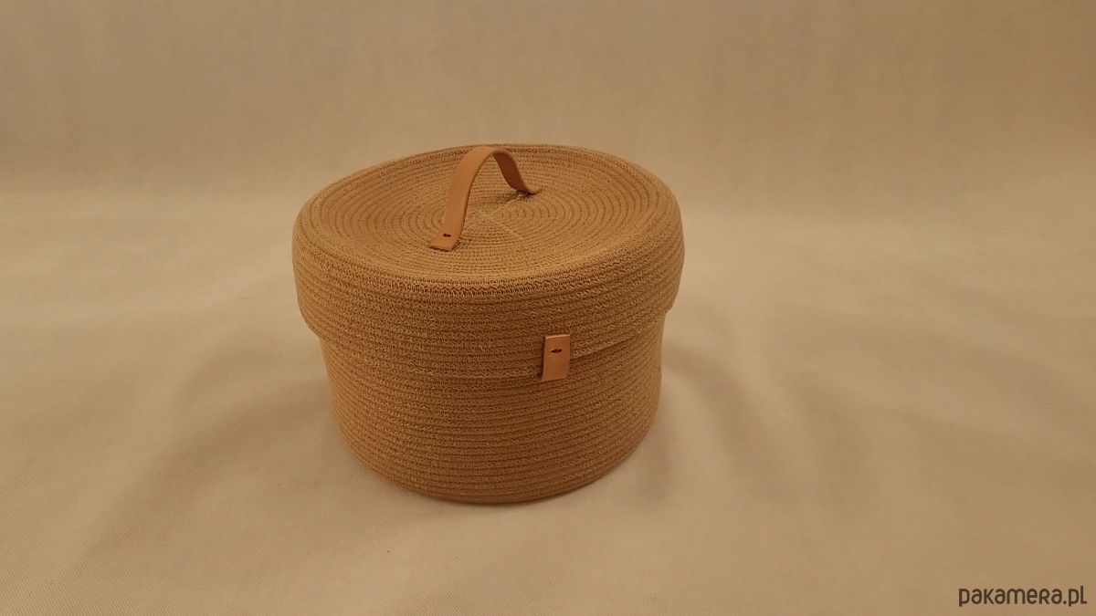 Pudelko koszyk ze sznurka bawełnianego. Na zamknięciu rączka ze skóry. Kolor beżowy.
